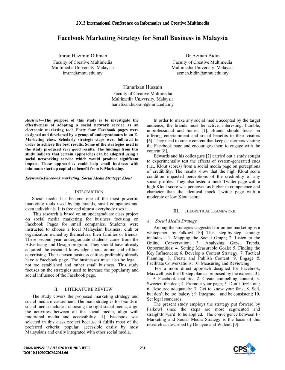 摘要:本研究的目的是调查采用社交网络服务作为电子营销工具的有效性。四十四个Facebook页面是由一群本科生在EMarketing课程中设计和开发的。遵循学术战略步骤以取得最佳成果。研究中使用的一些策略产生了非常好的结果。这项研究的结果表明,某些方法可以通过使用可产生重大影响的社交网络服务来采用。这些方法可以帮助小企业以最低的启动资金从电子营销中受益。