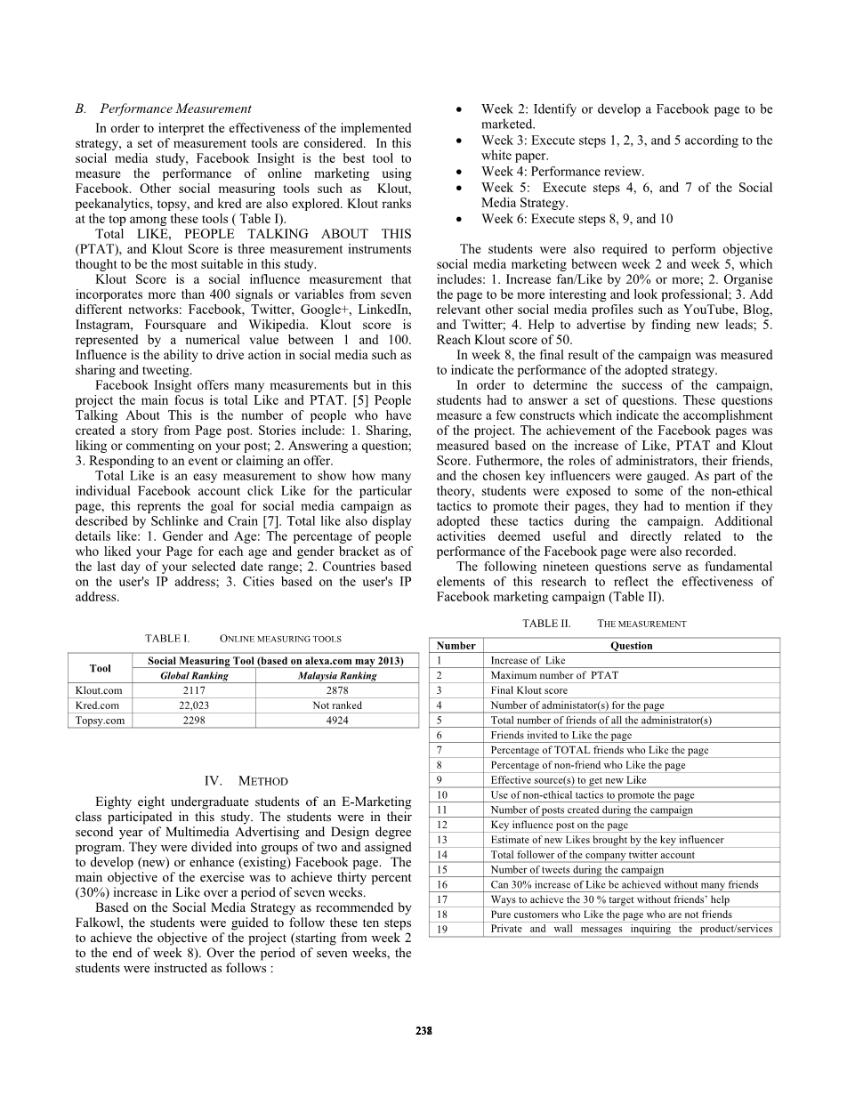 为了解释实施策略的有效性,我们考虑了一套测量工具。在这项社交媒体研究中,Facebook Insight是衡量使用Facebook在线营销表现的最佳工具。其他社会衡量工具,如Klout,peekanalytics,topsy和kred也被探索。Klout在这些工具中名列前茅。