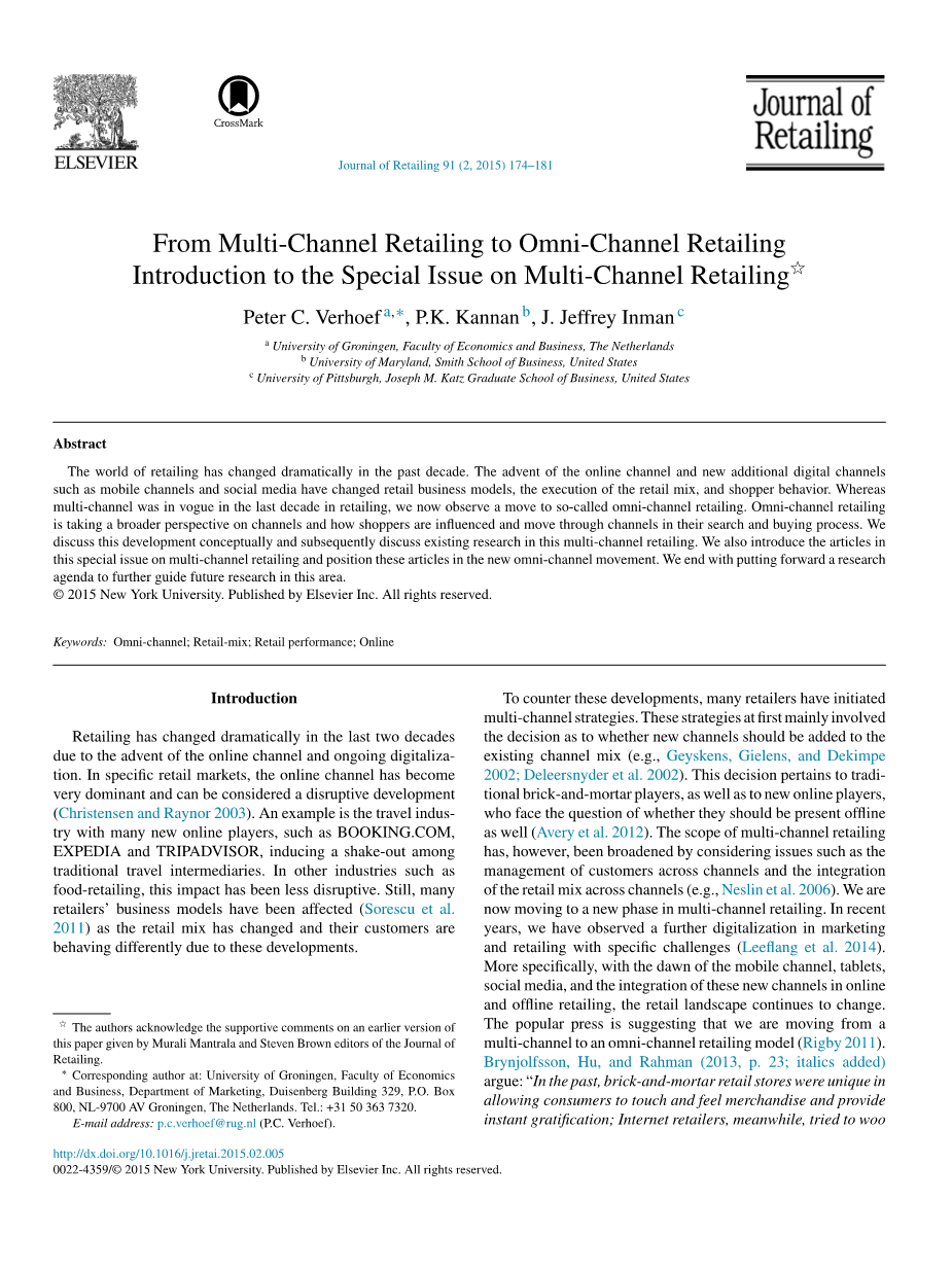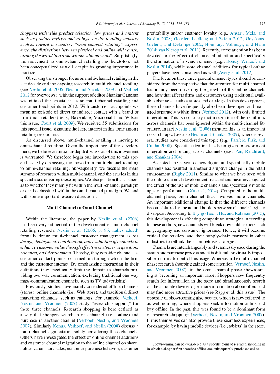 观察过去十年中对多渠道零售的更加关注以及正在进行的多渠道零售研究,在编辑Shankar Ganesan的支持下,我们在2012年发布了多渠道零售和客户接触点的特刊。通过客户接触点,我们指的是与品牌或公司(包括零售商)直接或间接接触的情节(例如Baxendale,Macdonald和Wilson等人,2009)。我们收到了55份关于这个特刊的意见,表明了零售研究人员对这个话题的兴趣。