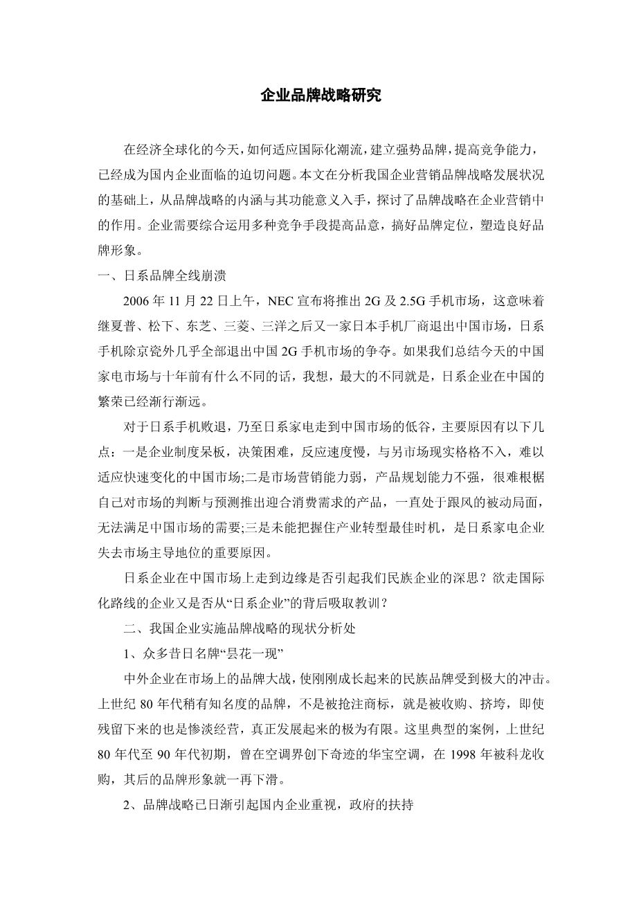 Economic globalization,how to adapt to international trends,establish,a strong brand and enhance our competitiveness,have become pressing issues facing enterprises.Based on the analysis of the development of corporate marketing brand strategy in enterprise marketing role.Enterise needs to sue a variety of means ofcompetition to increase brand awarenss, improve brand positioning, an create a good brand image.