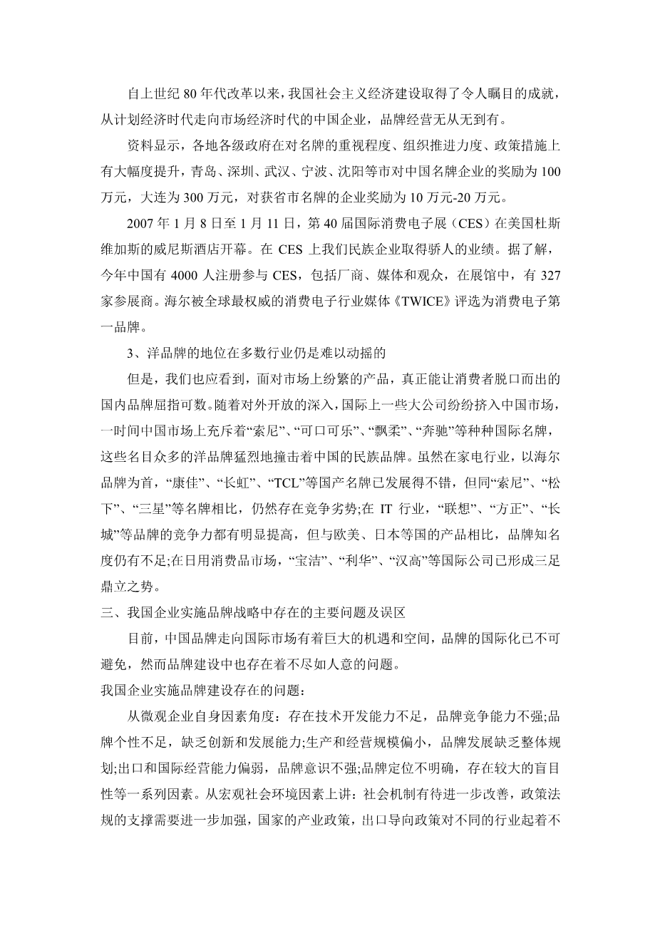 The status of foreign brands in most sectors is still difficult to shake However,we should also see the face of numerous products on the market,allows consumers blurted out genuinely few domestic brands.With the opening up further,to a number of big companies have to squeeze into the Chinese market,Chinese market,a time filled with“sony”,“Coca-Cola”,“rejoice”,“Benz”and various other internantional brands,many of these names foreign brands violently hitting the national brand in China.Although the appliance industry ,led by haier brand,“Konka”,“Changhong”,“TCL”and other domestic brands have developed well,but with the “Sony”,“Panasonic”“Samsung”and other brands,they are still there competitive disadvangtage;in the IT industry,“Lenovo”,“Founder”,“Great Wall”and other countries compared to ,brand awareness is still insufficient;in Consumer Goods