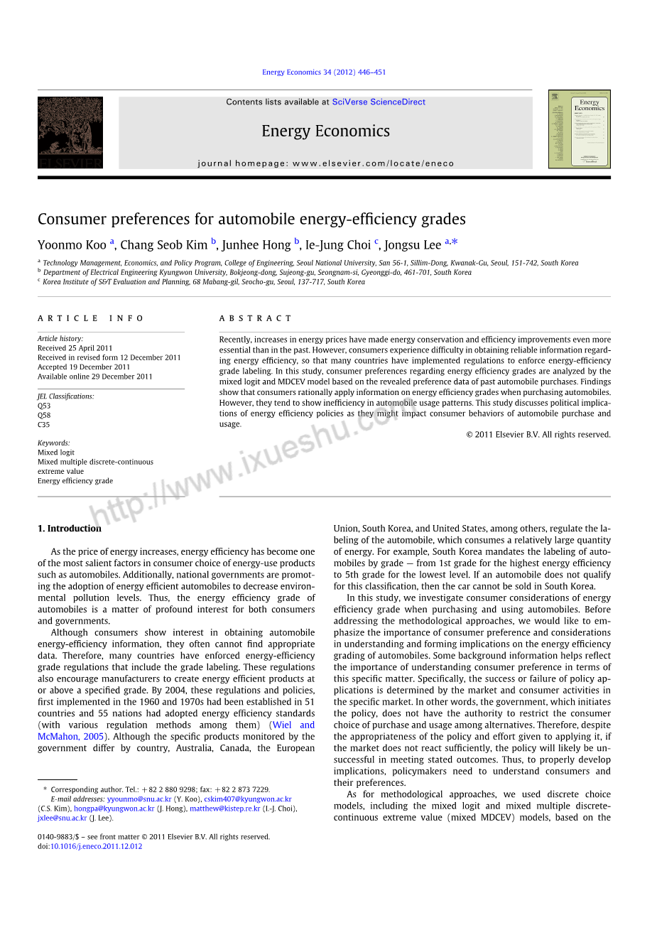 摘要:最近,能源价格的上涨使得节能和提高效率比过去更加重要。然而,消费者在获得有关能效的可靠信息方面遇到困难,因此许多国家已经实施了能效等级标识的法规。本研究利用混合logit模型与MDCEV模型,以过往购车偏好资料为基础,分析消费者对能源效率等级的偏好。研究结果表明,消费者在购买汽车时合理地运用能源效率等级信息。然而,它们往往表现出汽车使用模式的低效性。本研究探讨了能源效率政策对消费者购买和使用汽车行为的影响。