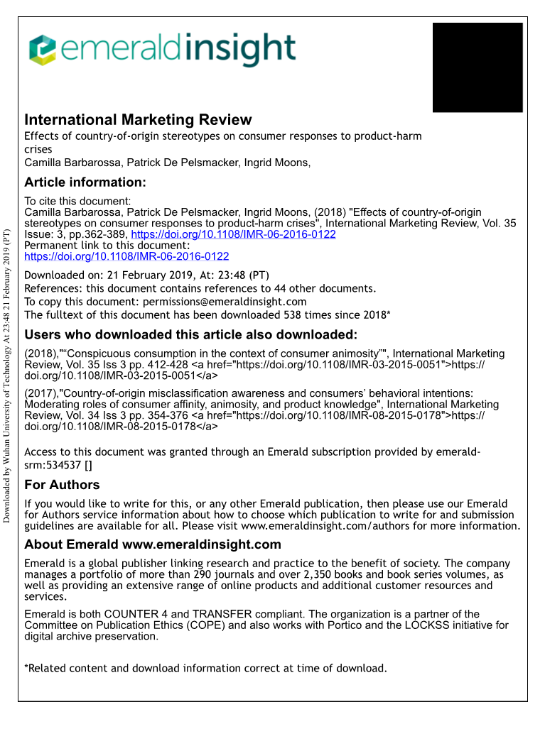 原产地刻板印象对消费者 如何应对产品有害危机的影响外文翻译资料
