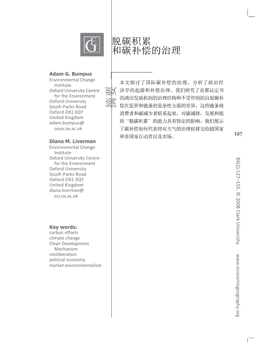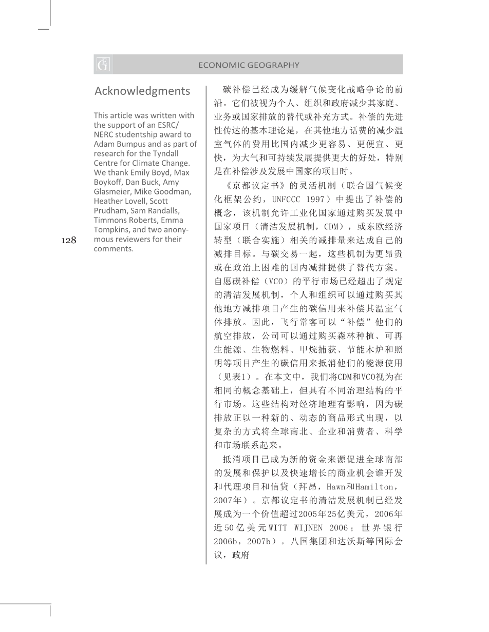 This article was written with the support of an ESRC/ NERC studentship award to Adam Bumpus and as part of research for the Tyndall Centre for Climate Change. We thank Emily Boyd, Max Boykoff, Dan Buck, Amy Glasmeier, Mike Goodman, Heather Lovell, Scott Prudham, Sam Randalls, Timmons Roberts, Emma Tompkins, and two anony-