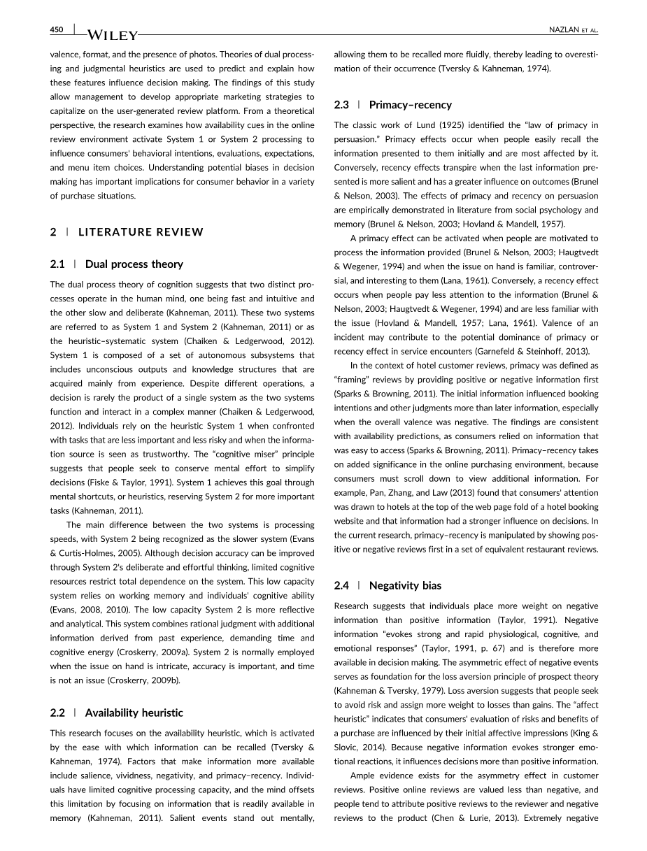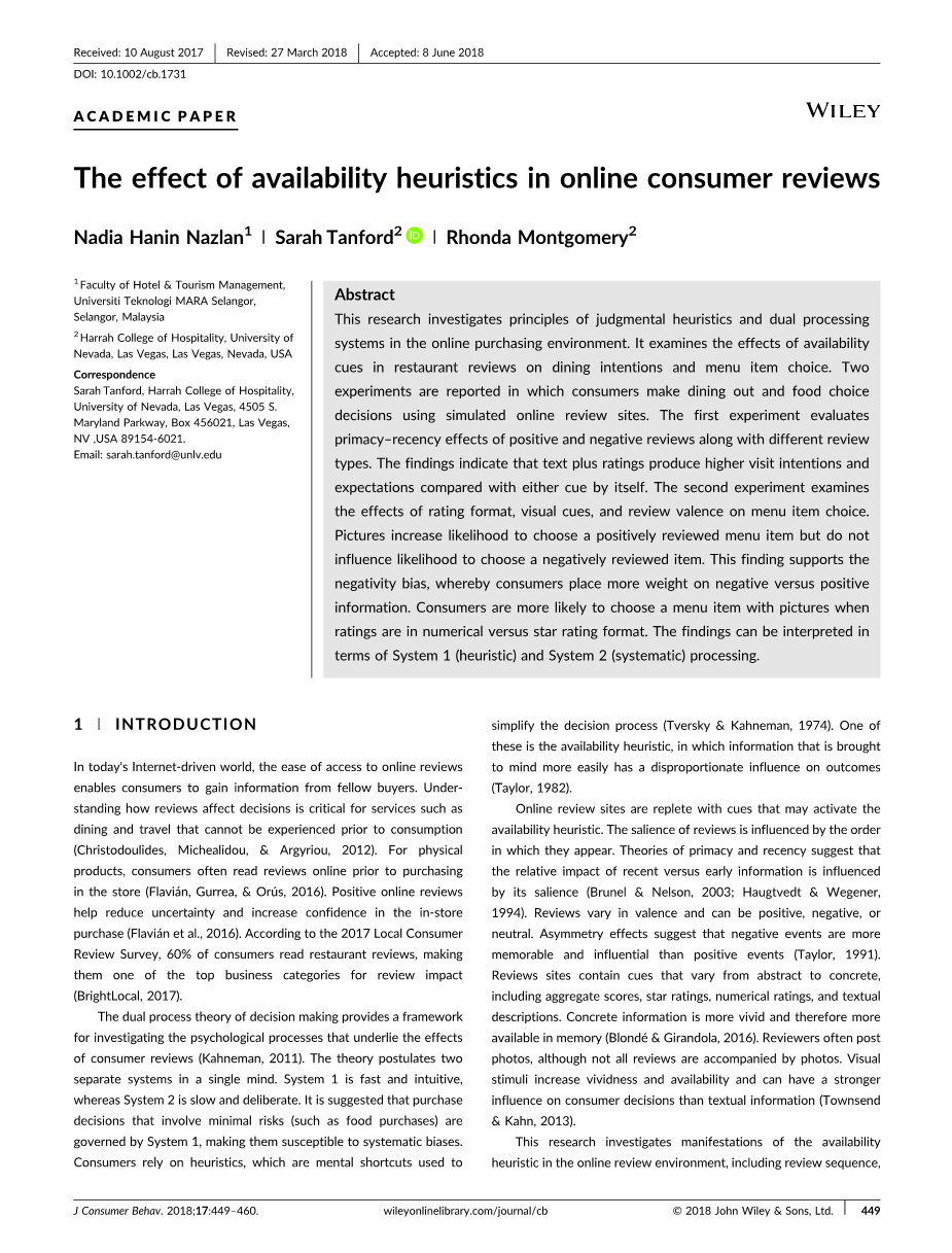 线上点评网站中随处可见能激活可用性启发式的线索。一方面,评论的效价(重要性)会受其呈现顺序的影响。系列位置效应理论认为最新出现的评论与最早出现的评论的相对重要性与其呈现方式的突出性有关。并且,不同性质的评论的效价也各不相同。不对称效应表明,负面事件比正面事件更加令人印象深刻也更有影响力。另一方面,点评网站里涵括了从抽象到具体的各种线索,包括总分、星级、排名、和文本描述。因为形象的信息更加生动,所以在记忆中更易被提取。所以评论者通常会在评论中添加照片,但并不是所有评论里都会有照片。视觉刺激增强了评论的生动性和可得性,相比于单纯的文本,能对消费者的决策起到更大影响。
