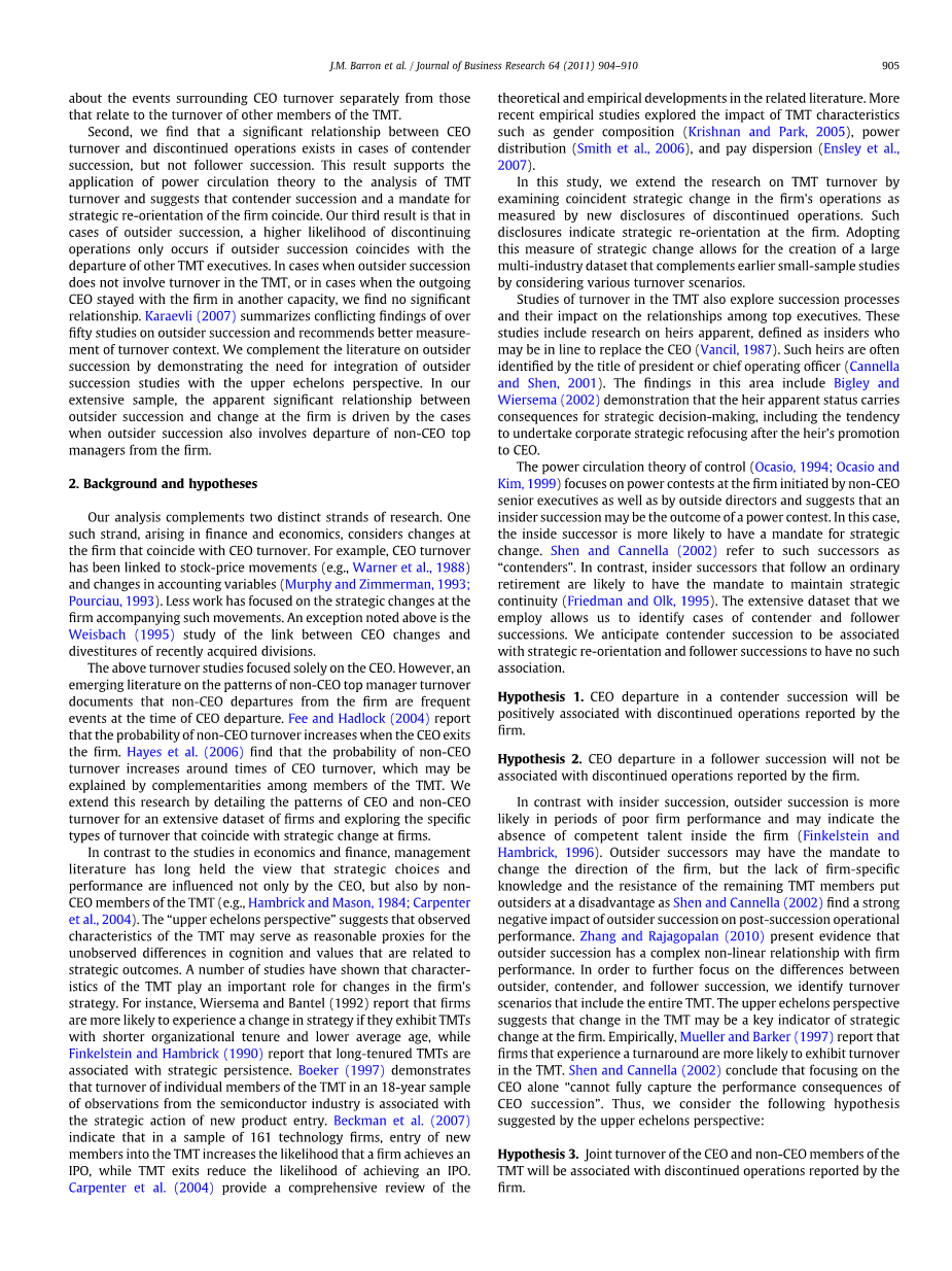 对高层管理团队(TMT)的研究发现,高层管理人员很少单独工作。高层观点(Hambrick和Mason,1984年)认为,高层管理团队的集体特征和行动可能会影响组织成果。然而,对经济和金融领域的高管人员更替的研究通常只关注CEO和公司绩效指标(如Murphy和Zimmerman,1993年;Warner等人,1988年;Pourciau,1993年;Huson等人,2004年)。本文献中的研究较少集中在与CEO离职同时发生的公司战略变革上。在一个例子中,Weisbach(1995)探讨了CEO离职与最近收购部门剥离的关联程度,并得出结论:随着负责收购的CEO被解雇,退出业务线和剥离不成功收购的可能性明显更高。