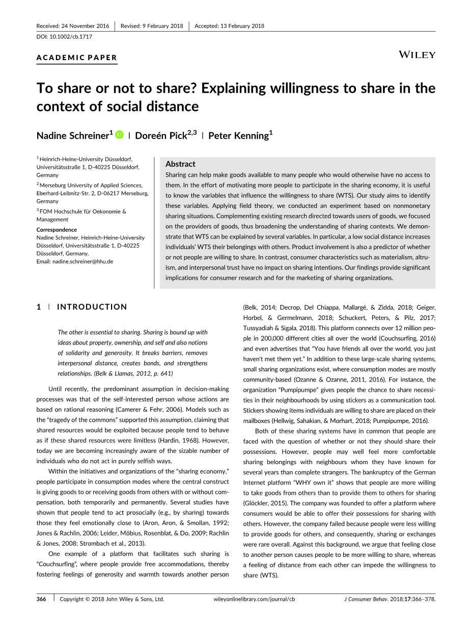 我们认为这是相关的,因为迄今为止大多数研究都集中在获得共享商品的人的视角上(Davidson, Habibi, amp; Laroche, 2018;Milanova amp; Maas, 2017;Schaefers, Lawson, amp; Kukar‐Kinney, 2015),只有少数研究聚焦于提供共享利益的人(Bocker amp; Meelen, 2017;Philip, Ozanne, amp; Ballantine, 2015)。有趣的是,根据2015年德国消费者权益组织“Verbraucherzentrale Bundesverband”发起的一项调查,79%的受访者(N = 1009)表示,他们愿意与他人分享,但仅限于与认识的人分享。只有9%的人表示他们是否认识这个人并不重要(Verbraucherzentrale, 2015)。此外,在消费者研究中,共享经济的先决条件——个人和组织允许他们的商品被访问及共享——在很大程度上被忽略了(Hawlitschek, Teubner, amp; Weinhardt, 2016)。我们的研究侧重于给予者的视角和意愿,因而,有助于更好地理解分享现象。