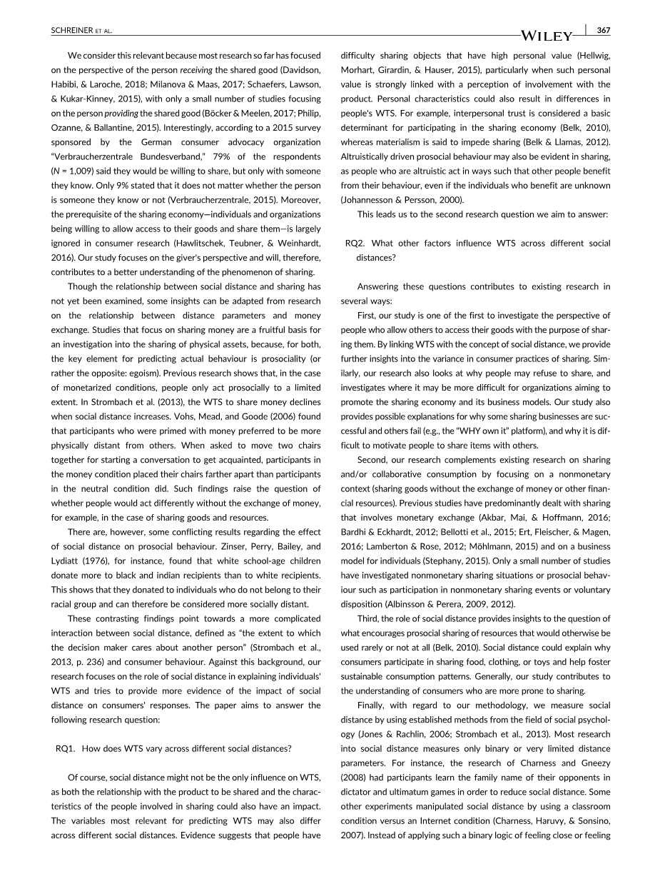 虽然社会距离和分享之间的关系还没有被研究,但是距离参数和金钱交换之间的关系的研究可以提供一些启示。集中于分享金钱的研究是调查物质资产分享的一个富有成果的基础,因为对这两种人来说,预测实际行为的关键因素是亲社会(或者相反:利己主义)。以往的研究表明,在货币化条件下,人们的亲社会行为是有限的。在Strombach et al.(2013)中,随着社会距离的增加,分享金钱的WTS值下降。Vohs, Mead, and Goode(2006)发现,那些被金钱刺激的参与者更愿意与他人保持身体上的距离。当被要求把两把椅子挪到一起,开始一段对话来认识对方时,金钱条件下的参与者比中性条件下的参与者把椅子挪得更远。这些发现提出了这样一个问题:例如,在共享商品和资源的情况下,如果没有货币交换,人们的行为是否会有所不同?