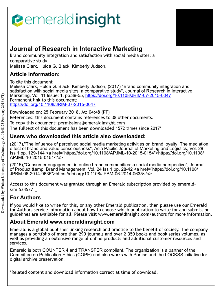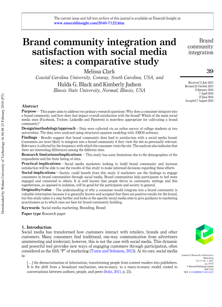 目的——本文旨在解决两个主要的研究问题:消费者为什么要融入一个品牌社区,这对品牌的整体满意度有何影响?哪个主要的社会媒体网站(Facebook、Twitter、LinkedIn和Pinterest)或多或少适合培养品牌。