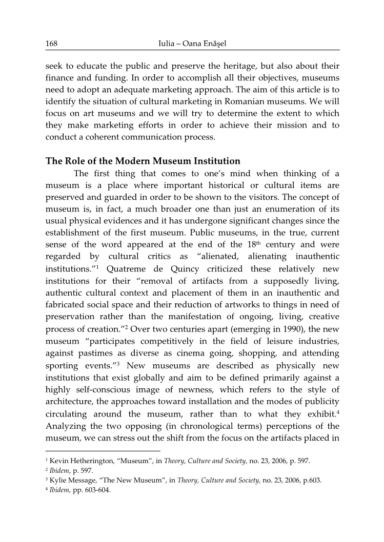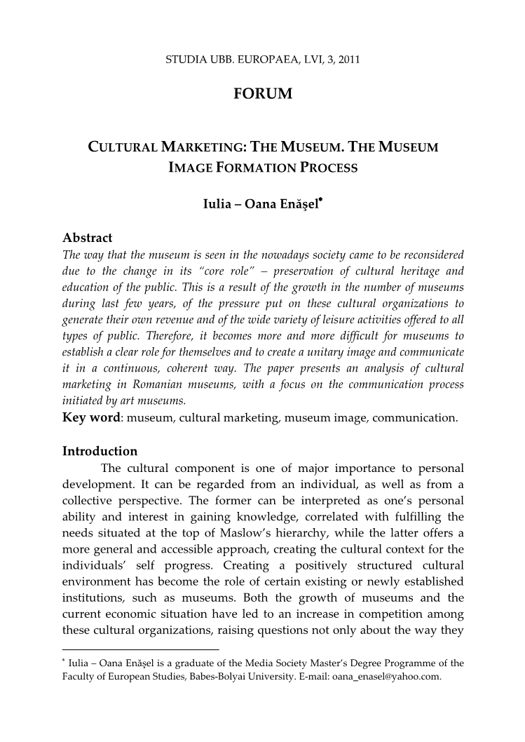 文化因素是影响个人发展的重要因素之一。它可以从个人和集体的角度来看待。前者可以被理解为一个人获取知识的能力和兴趣,与满足马斯洛上层社会的需求相关,而后者则提供了一种更普遍和更容易理解的方法,为个人的自我进步创造了文化背景。创造一个结构积极的文化环境已经成为某些现有或新建立的机构(如博物馆)的作用。博物馆的发展和当前的经济形势导致这些文化组织之间的竞争加剧,不仅提出了他们教育公众和保护遗产的方式,而且还提出了他们的财务和资金问题。为了实现所有的目标,博物馆需要采取适当的营销方法。本文旨在探讨罗马尼亚博物馆文化营销的现状。我们将把重点放在艺术博物馆,我们将努力确定他们在多大程度上进行营销,以实现他们的使命,并进行连贯的沟通过程。