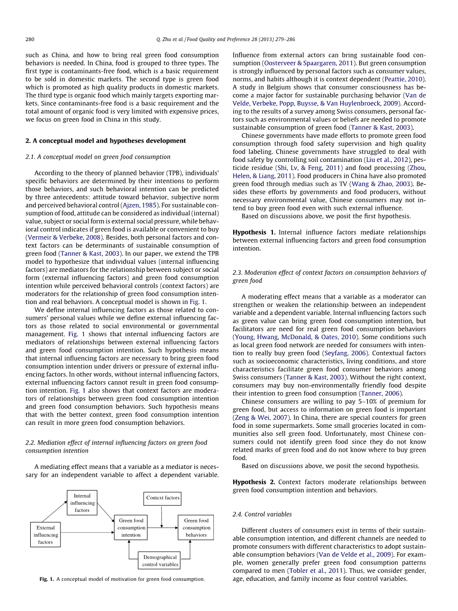 中国政府通过食品安全监管和优质食品标签,努力推动绿色食品消费。 中国政府一直在努力通过控制土壤污染来应对食品安全问题(Liu et al., 2012), 农药残留(Shi, Lv, amp; Feng, 2011)和食品加工(Zhou, Helen, amp; Liang, 2011)。中国的食品生产商也通过电视等媒体推广绿色食品(Wang amp; Zhao, 2003)。除了政府和食品生产商的这些努力之外,在没有必要的环境价值的情况下,即使有这样的外部影响,中国消费者也可能不打算购买绿色食品。