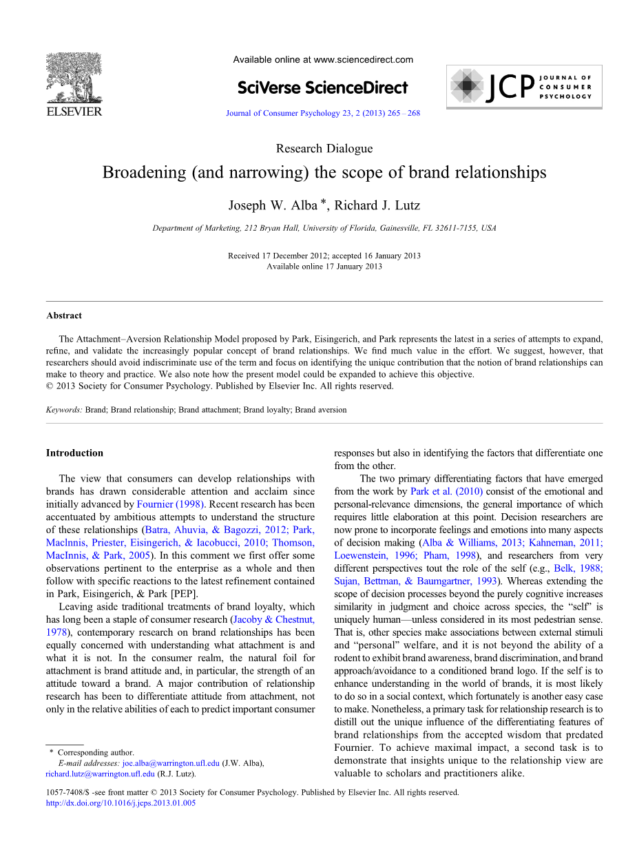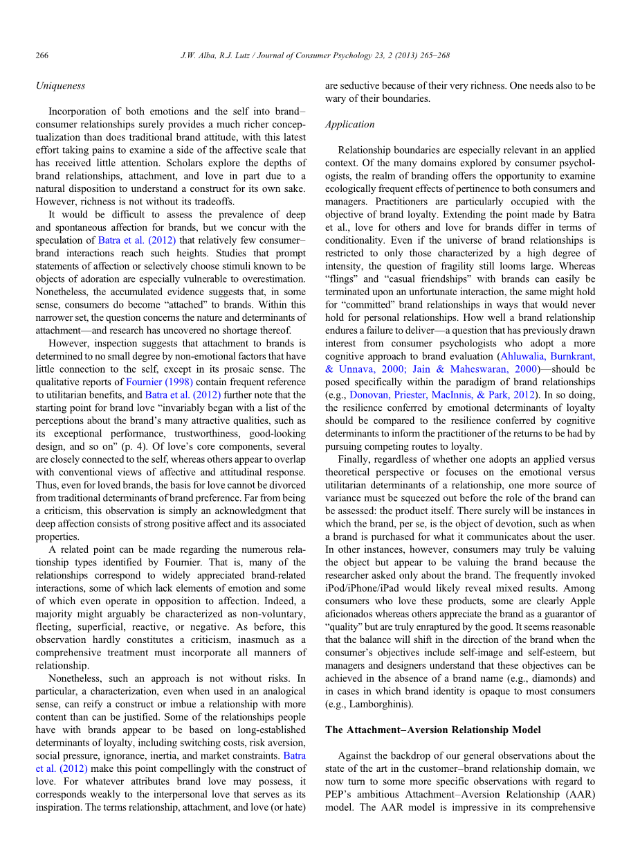 最初,Fournier(1998)提出消费者可以与品牌发展关系的观点以后,就引起了相当多的关注和赞誉。最近的研究(Batra, Ahuvia, amp; Bagozzi, 2012; Park, Maclnnis, Priester, Eisingerich, amp; Iacobucci, 2010; Thomson, MacInnis, amp; Park, 2005)企图通过许多野心勃勃的尝试来加深了解这些关系的结构。在这篇评论中,我们首先提供了一些与整个企业相关的意见,然后以具体的反馈跟进包含在Park、Eisingerich和Park[pep]理论中的最新改进。