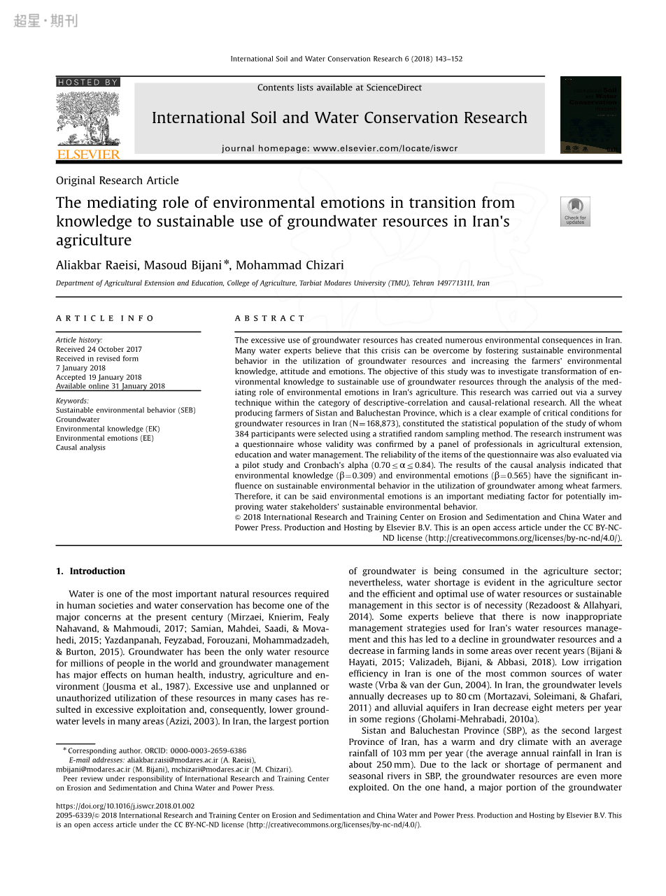 The mediating role of environmental emotions in transition from knowledge to sustainable use of groundwater resources in Iran#39;s agriculture