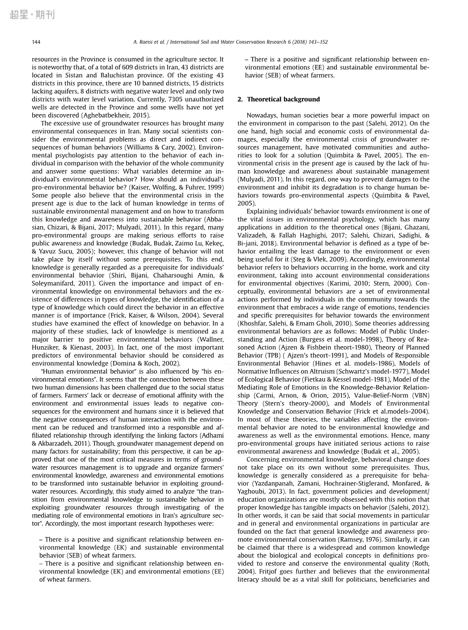 水是人类社会所需的最重要的自然资源之一, 节约用水已成为本世纪的主要关切之一 (Mirzaei、Knierim、Fealy Nahavand、amp; Mahmoudi, 2017;Samian, Mahdei, Saadi, amp; Mova-hedi, 2015;Yazdanpanah, Feyzabad, Forouzani, Mohammadzadeh, amp; Burton, 2015年)。地下水一直是世界上数百万人唯一的水资源, 地下水管理对人类健康、工业、农业和环境产生重大影响 (Jousma 等人, 1987年)。在许多情况下, 过度使用这些资源以及无计划或未经授权地利用这些资源导致过度开采, 从而降低了许多地区的地下水位 (Azizi, 2003年)。在伊朗, 农业部门消耗的地下水占地下水的最大部分;然而, 农业部门的缺水现象十分明显, 该部门必须有效和最佳地利用水资源或可持续管理 (Rezadoost amp; Allahyari, 2014年)。一些专家认为, 现在伊朗水资源管理采用了不适当的管理战略, 这导致近年来地下水资源减少, 一些地区的农田减少 (Bijani amp; Hayati, 2015;瓦里扎德, Bijani amp; Abbasi, 2018年)。伊朗灌溉效率低是最常见的水污染源之一 (Vrba amp; van der Gun, 2004年)。在伊朗, 地下水位每年下降高达80厘米 (Mortazavi, Soleimani, amp; Ghafari, 2011年), 伊朗的冲积含水层在一些地区每年减少8米 (Gholami-me打马迪, 2010a)。 锡斯坦和俾路支斯坦省 (SBP) 作为伊朗第二大省, 气候温暖干燥, 年平均降雨量为103毫米 (伊朗年平均降雨量约为250毫米)。由于 SBP 缺乏或缺乏永久和季节性河流, 地下水资源得到了更多的开发。一方面, 地下水的很大一部分.