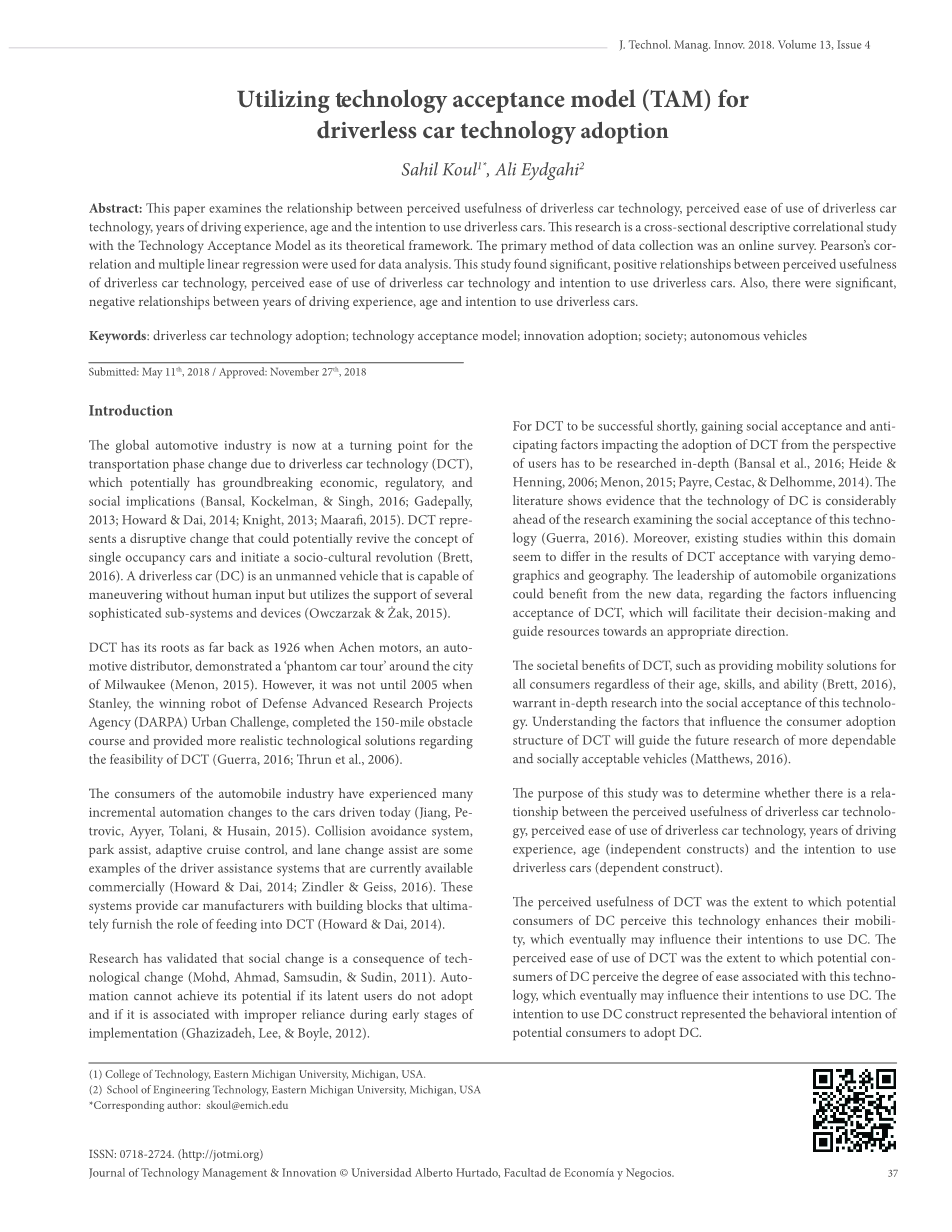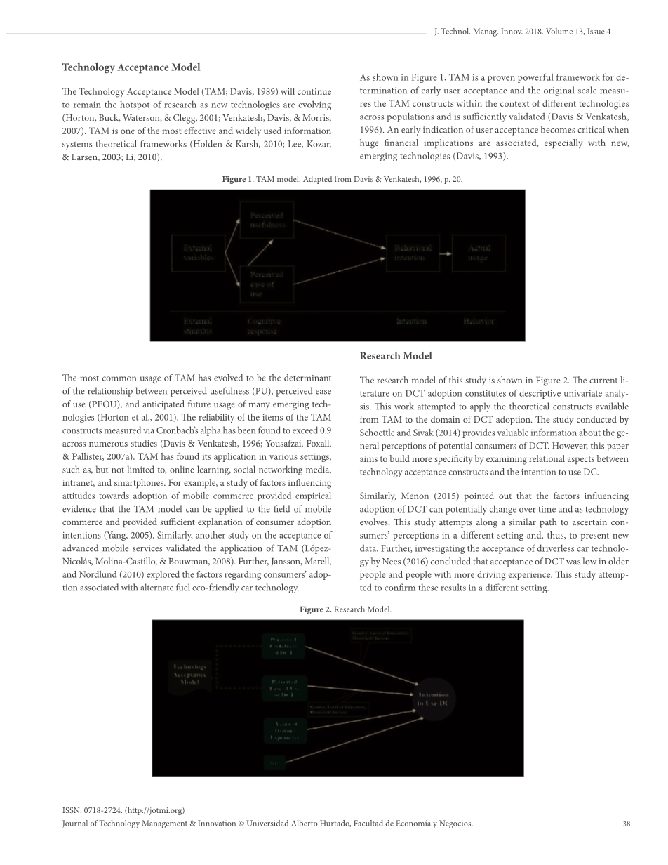为了使DCT很快取得成功,必须深入研究从用户的角度获得社会认可和预测影响DCT采用的因素(Bansal等,2016; Heide&Henning,2006; Menon,2015; Payre, Cestac,&Delhomme,2014)。文献显示,DC的技术远远超过了研究该技术的社会接受度的研究(Guerra,2016)。此外,该领域的现有研究似乎在DCT接受的结果与不同的人口统计学和地理学方面存在差异。汽车组织的领导能够从新数据中受益,这些数据涉及影响DCT接受的因素,这将有助于他们的决策并引导资源朝着适当的方向发展。