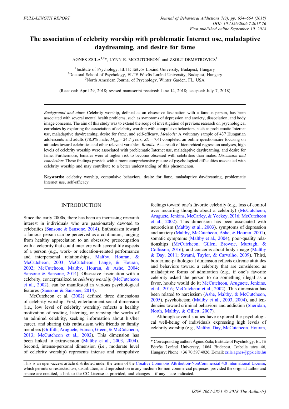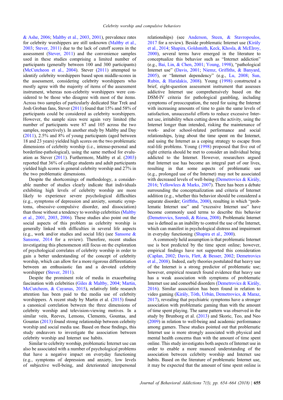 一个常见的假设是有问题的互联网使用最好通过在线时间预测;然而,实证研究结果并未支持这一考虑(Caplan,2002; Davis,Flett,&Besser,2002; Demetrovics等人,2008)。事实上,早期的理论假设大量使用互联网是有问题使用的强有力预测因素;然而,实证研究发现了大量使用的证据与症状有关的弱关联互联网使用和合并症(Demetrovics&Kiraacute;ly,2016)。已发现类似的关联视频游戏(Kiraacute;ly,T#39;oth,Urbaacute;n,Demetrovics和Maraz,2017),揭示精神症状更强与有问题的游戏相关联而不是数量花在玩的时间。在该中观察到相同的模式Brunborg等人的研究。 (2013年)和Skoric,Teo和Neo(2009年)与福祉和学业成绩有关游戏玩家之间。这些研究指出存在问题互联网的使用与物理和体育的联系更紧密心理健康问题比花费的时间长线上。本研究调查了互联网使用的两个方面以便能够更细致地理解名人崇拜与互联网使用之间的联系习惯。基于有问题的互联网使用的文献,可以预期,在线花费的时间与名人崇拜和强迫行为无关与名人崇拜无关,而有问题互联网使用可能是这种结构的可能关联。此外,这项研究努力提供更细微的与之相关的心理困难图片名人崇拜通过扩大调查范围适应不良的白日梦,渴望成名和自我效能。适应不良的白日梦也可以被视为一种因为这个名人崇拜的潜在相关性两者的心理决定因素的相似之处现象。更具体地说,适应不良的白日梦指的是一种取代人类的广泛幻想活动互动和/或干扰学术,人际关系或职业运作“(Somer,2002,p.199)。确实,适应不良的白日梦者更有可能报道ADHD症状,强迫症和解离(Bigelsen,Lehrfeld,Jopp,&Somer,2016)。
