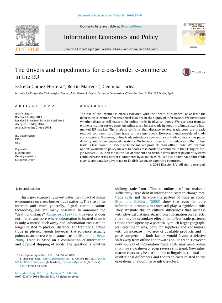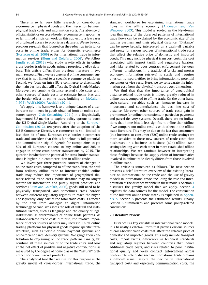 迄今为止,关于实体商品跨境电子商务以及实物贸易成本与信息成本之间的相互作用的研究很少。关于货物跨境电子商务的缺乏统计数据迄今为止限制了有关这一问题的经验性工作,在少数几种特权访问专有数据集的情况下。对于国内电子商务(Hortaccedil;suet al。,2009)或国际信息服务贸易(Blum and Goldfarb,2006),我们超越了以往关于在线交易的距离成本减少的研究。我们遵循Lendle等人(2012),他们使用专有的eBay数据库研究在线跨境货物贸易中的重力影响。本文不同于以前的文献两个主要方面。首先,我们使用与特定电子商务平台无关的通用在线消费者调查。第二,我们专注于欧盟内部的电子商务,解决仍然影响数字单一市场的主要障碍。此外,我们将距离相关贸易成本与其他贸易成本来源相结合,以McCallum(1995),Wolf(2000),Pacchioli(2011)为基础,估算家庭偏差和在线交易的边界效应。