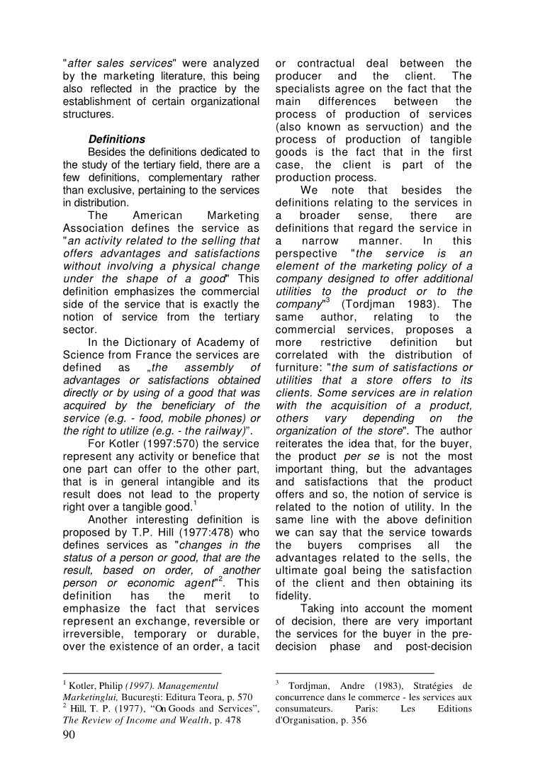 根据上述定义,我们将服务的概念与第三产业或服务融入产品,涉及到一个更广泛的意义上说,为了检查经销商的优势与商业相关的建议。我们只会提到一种附带有形商品的服务,即家具。的各种服务,陪一个实实在在的好需要它们的分类从连贯的类型不互相排斥,但允许整个范围的调查服务和他们的发音,同时,允许类型学的评价将作为一个参考框架。