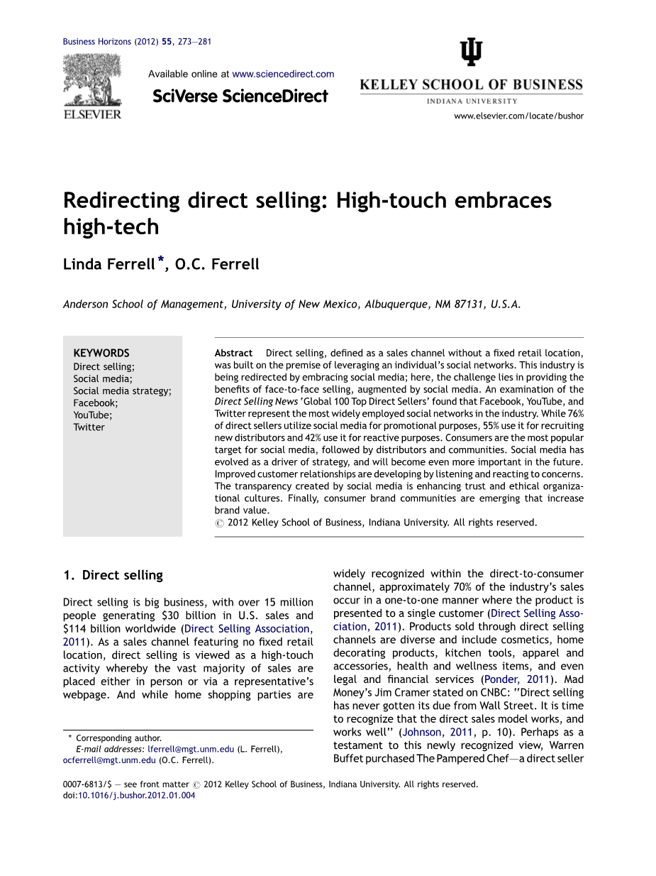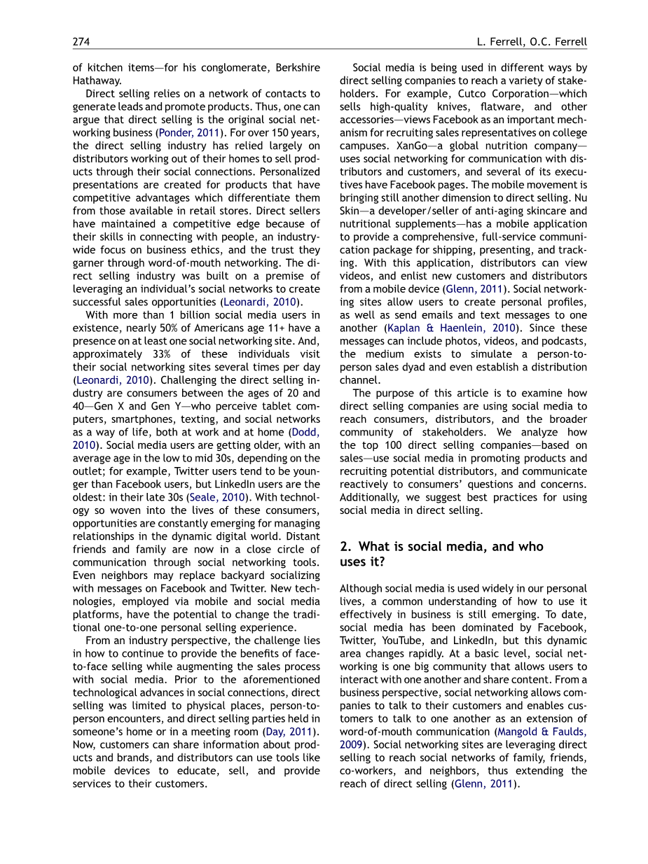 而平台如脸谱网、推特,YouTube已经成为大多数企业的网站,这些往往被视为独立的营销工具,而不是作为销售战略的一个组成部分(汉娜,Rohm,amp; Crittenden,2011)。虽然客户利用社交媒体平台,许多高管不懂他们;他们可以采取多种形式;以及如何制定策略来监控,理解,和销售增长(里基茨曼,hermkens、麦卡锡和希尔维斯特,2011)。在直销市场,社交媒体网站通常被用来作为与分销商和消费者沟通的一种手段。例如,Mary Kay利用其社交媒体平台,主要是吸引客户,和Scentsy–-家香水–供应商认为其成功主要是消费者粉丝页面。前面提到的XanGo集中在脸书和推特现有客户作为一个保留的工具,和安利视社交媒体在品牌的发展是很重要的。ViSalus科学–-自称# 1减肥和健身挑战平台在北美洲–-同样是使用社交媒体工具来帮助经销商招聘和管理自己的企业(格伦,2011)。