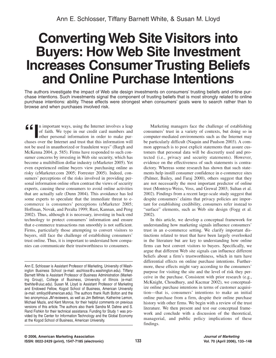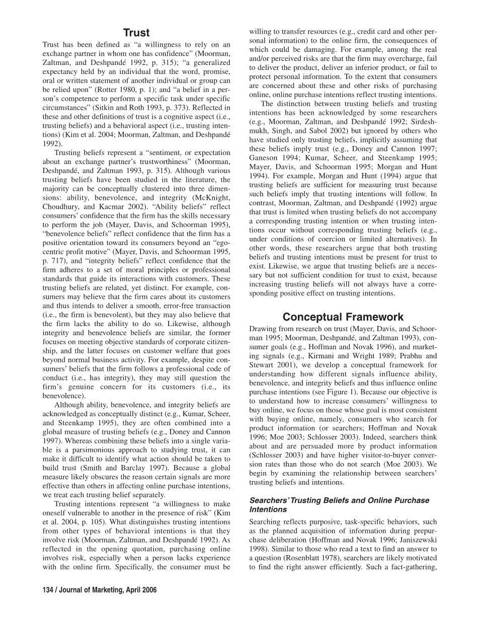 在本文中,我们提出了一个概念框架,以了解营销信号如何影响消费者在电子商务环境下的信任。我们澄清了与信任相关的重要问题,这些问题在文献中基本上被忽略了,但却是理解网络公司如何最好地将访问者转化为买家的关键。具体来说,我们认为不同的网站信号会影响到不同的公司对可信赖性的信任,而这反过来又会对在线购买意愿产生不同的影响。此外,根据消费者访问网站的目的和他们在购买过程中所面临的风险程度,这些影响可能会有所不同。与先前的研究(如McKnight,Choudhury,Kacmar 2002)一致,尽管他们与其他公司的线上购买历史不同,我们从客户获取的角度来定义在线购买意愿——即消费者从公司进行首次在线购买的意愿。首先回顾一下信任文献,然后,提出并测试我们的概念框架,并以讨论对于理论、管理和公共政策方面的影响作为结论。