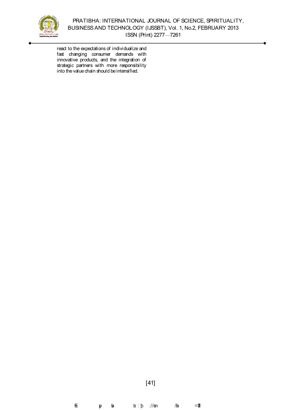 Sumit Jain&Dr.R.K.Garg在他们的研究论文中描述了当前汽车行业的情况和行业面临的挑战。他们指出,公司不得不缩短产品生命周期,以便对创新产品对个性化和快速变化的消费者需求的期望作出反应,并且应该加强战略合作伙伴与价值链责任的整合。