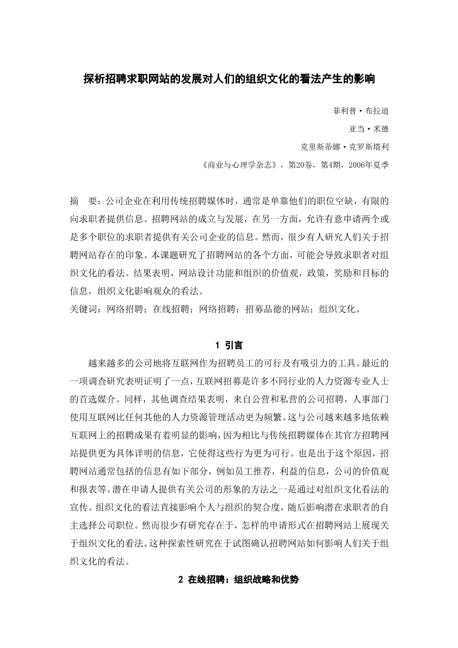 KEY WORDS: Internet recruiting; online recruiting; web recruiting; recruit ment websites; organizational culture.