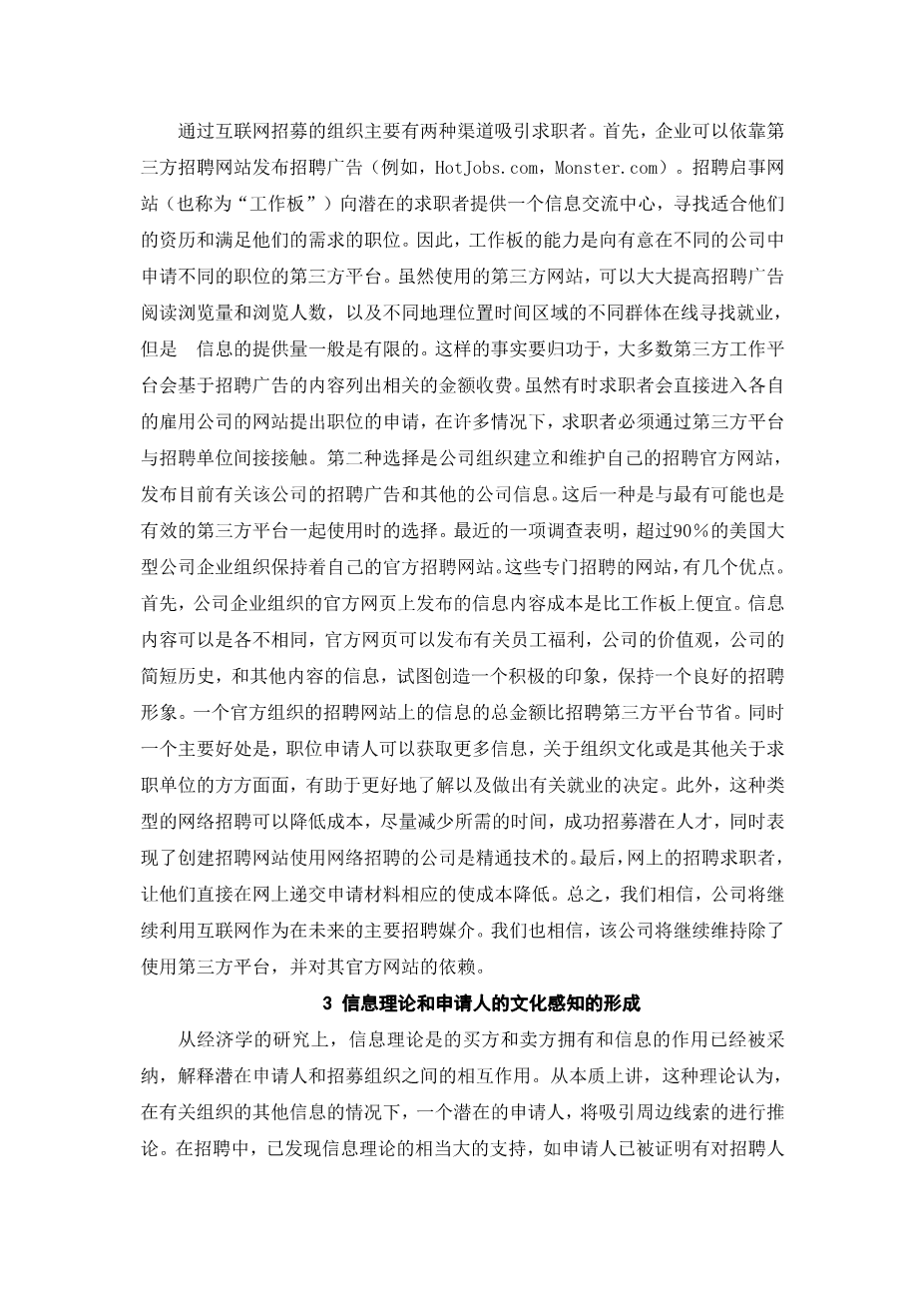 Organizations recruiting via the Internet have two primary avenues to attract viewers into the applicant pool. First, organizations can rely upon third-parties that distribute job advertisements on a job listing website (e.g., HotJobs.com, Monster.com). Job listing websites (a.k.a., "job boards") have the advantage of providing a clearinghouse for potential job applicants to search across organizations for positions appropriate to their qualifications and that meet their needs. Therefore, job boards have the ability to alert potential applicants to openings in many organizations. While the use of third-party websites or job boards can greatly increase the number of viewers reading the job advertisement and potentially reach a more geographically diverse group of applicants searching for jobs online (Crispin amp; Mehler, 1997), the amount of information that is available to the applicant is generally quite limited. This can likely be attributed to the fact that most third-party job boards charge fees based on the amount of content listed in the job advertisement. Moreover, although applicants are sometimes provided with direct access to the respective hiring companies' websites (Zusman amp; Landis, 2002), in many cases applicants must apply to the hiring organization indirectly through the third-party organization (Recruiting, 1999). A second option is for an organization to create and maintain its own official website to present job advertisements and additional information about the company (Zusman amp; Landis, 2002). This latter option is most likely to be effective when used in conjunction with job boards. One recent survey indicates that over 90% of large U.S. organizations maintain their own official recruiting websites (Cappelli, 2001). These websites, dedicated solely to recruitment, have several advantages. First, content can be posted much more cheaply on the organization's official web page than on a job board. Though content varies consider ably, organizations can post information about employee benefits, organizational values, a brief history of the organization, and additional content to attempt to create a positive impression needed to maintain a favorable recruitment image (Gatewood, Gowan, amp; Lautenschlager, 1993). The overall amount of information on an official organizational recruitment website is much greater than from a job advertisement alone (Braddy, Thompson, Wuensch, amp; Grossnickle, 2003). A major benefit of this additional content is that applicants can acquire more information regarding organizational culture, which may facilitate making better informed employment-related decisions. Additionally, this type of web recruiting can reduce costs (Cober et al., 2000; Kay, 2000; Marcus, 2001), minimize the amount of time required to successfully recruit applicants (Web Recruiting Advantages, 2001), and create the perception that companies who use