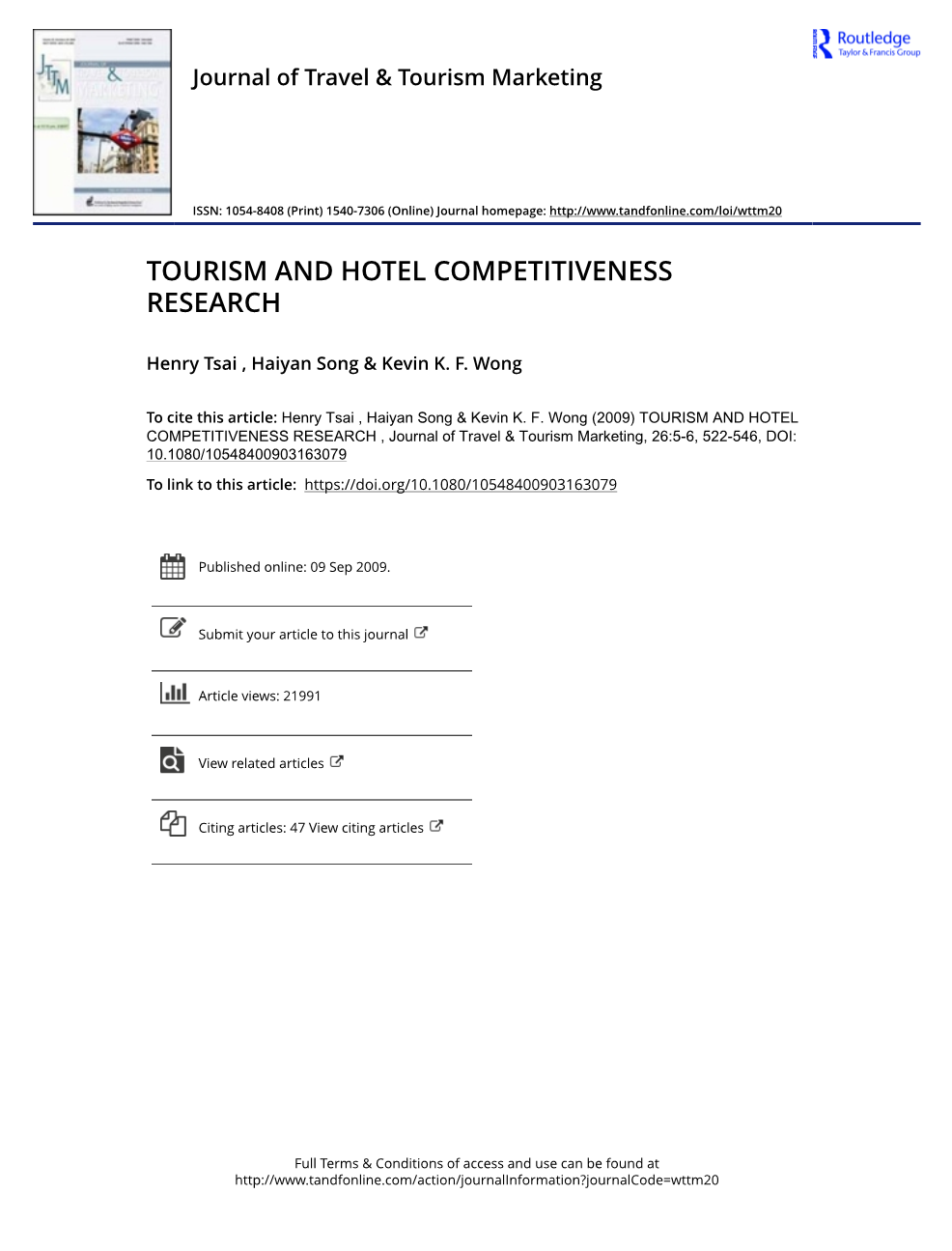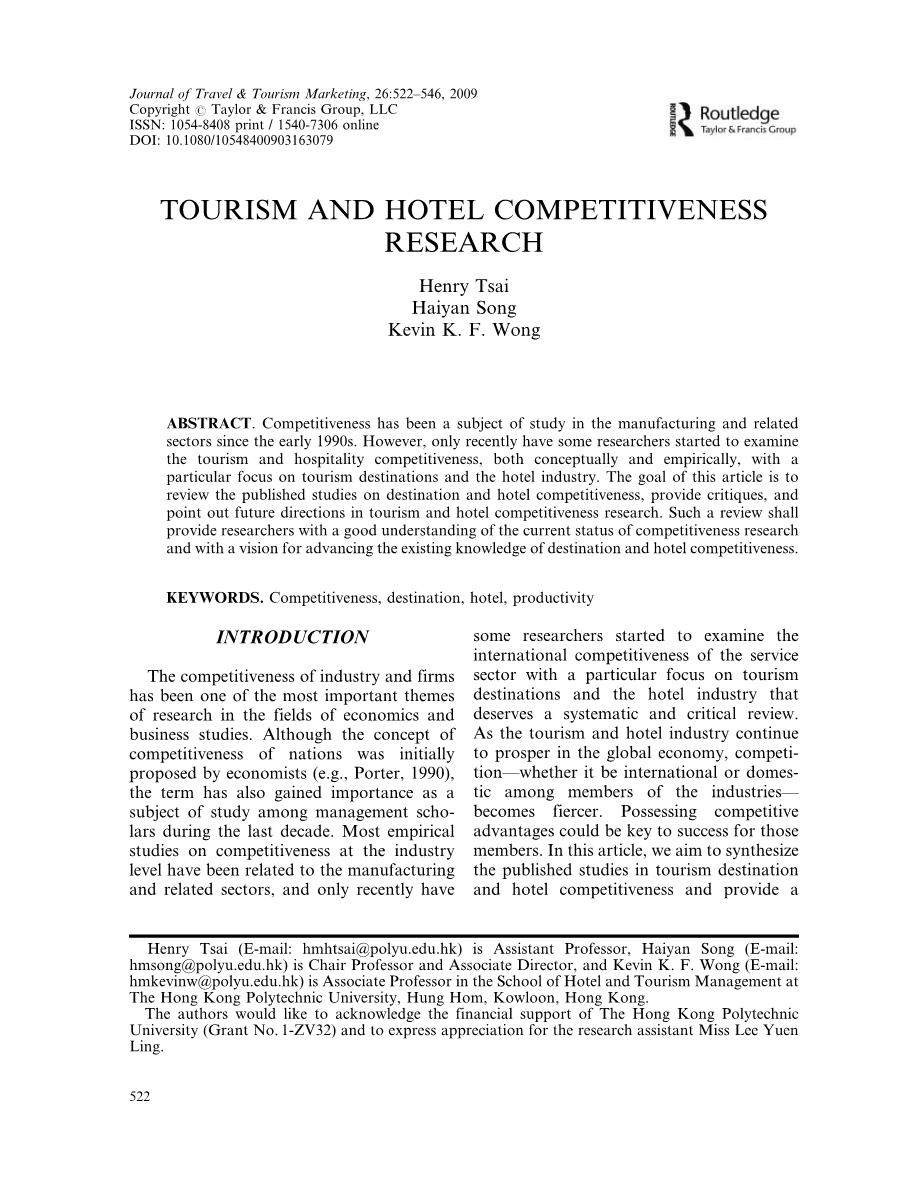 介绍:行业和企业的竞争力一直是经济和商业研究领域最重要的研究课题之一。虽然国家竞争力的概念最初是由经济学家提出的(如Porter,1990),但这个术语作为管理学者在过去十年的研究课题也变得越来越重要。大多数关于行业竞争力的实证研究都与制造业和相关部门有关,直到最近才有一些研究人员开始考察服务业的国际竞争力,特别关注旅游目的地和酒店业,这些应该是系统性的和严格的审查。随着旅游业和酒店业在全球经济中继续蓬勃发展,无论是国际还是国内的行业成员,都将变得更加激烈。拥有竞争优势可能是这些成员获得成功的关键。在本文中,我们旨在综合已发表的关于旅游目的地和酒店竞争力的研究,并提供以前审查过的内容的全面图景,以促进这些领域的进一步研究。
