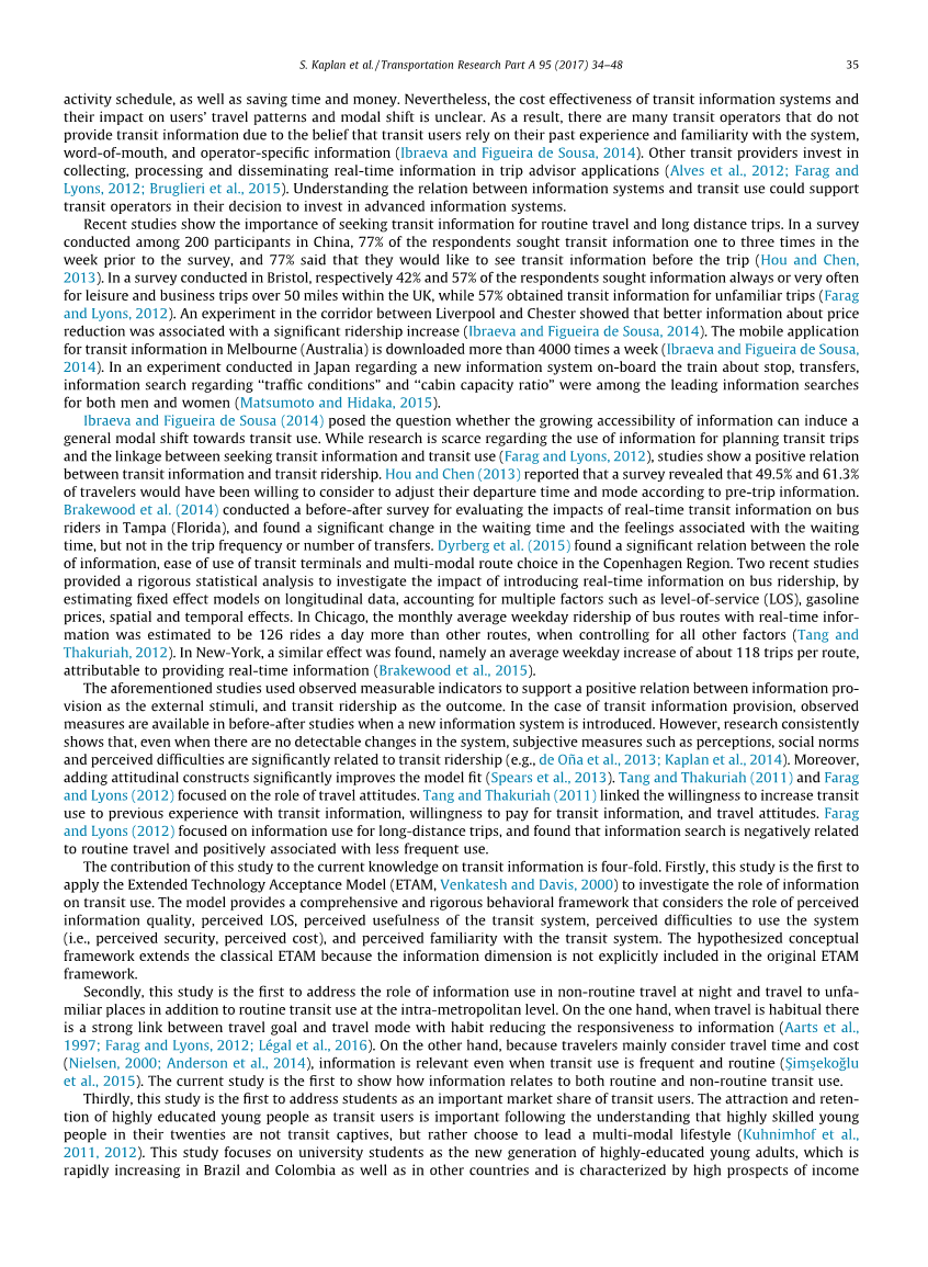 The lifestyle of young people is shifting from the traditionally well-rooted and routine lifestyle to a more dynamic one, continuously changing residence place and activity patterns, due to the need for higher education, the competition in the labor market, the need for business travel, higher leisure consumption and globalization. When coupled with growing city complexity and size, this lifestyle, which necessitates people to be constantly on the move in unfamiliar environments, gen-erates high demand for travel information. The more time people spend moving around in complex unfamiliar environ-ments, the more important is getting relevant and reliable information in a clear and efficient format for maintaining the activity schedule, as well as saving time and money. Nevertheless, the cost effectiveness of transit information systems and their impact on usersrsquo; travel patterns and modal shift is unclear. As a result, there are many transit operators that do not provide transit information due to the belief that transit users rely on their past experience and familiarity with the system, word-of-mouth, and operator-specific information (Ibraeva and Figueira de Sousa, 2014). Other transit providers invest in collecting, processing and disseminating real-time information in trip advisor applications (Alves et al., 2012; Farag and Lyons, 2012; Bruglieri et al., 2015). Understanding the relation between information systems and transit use could support transit operators in their decision to invest in advanced information systems.