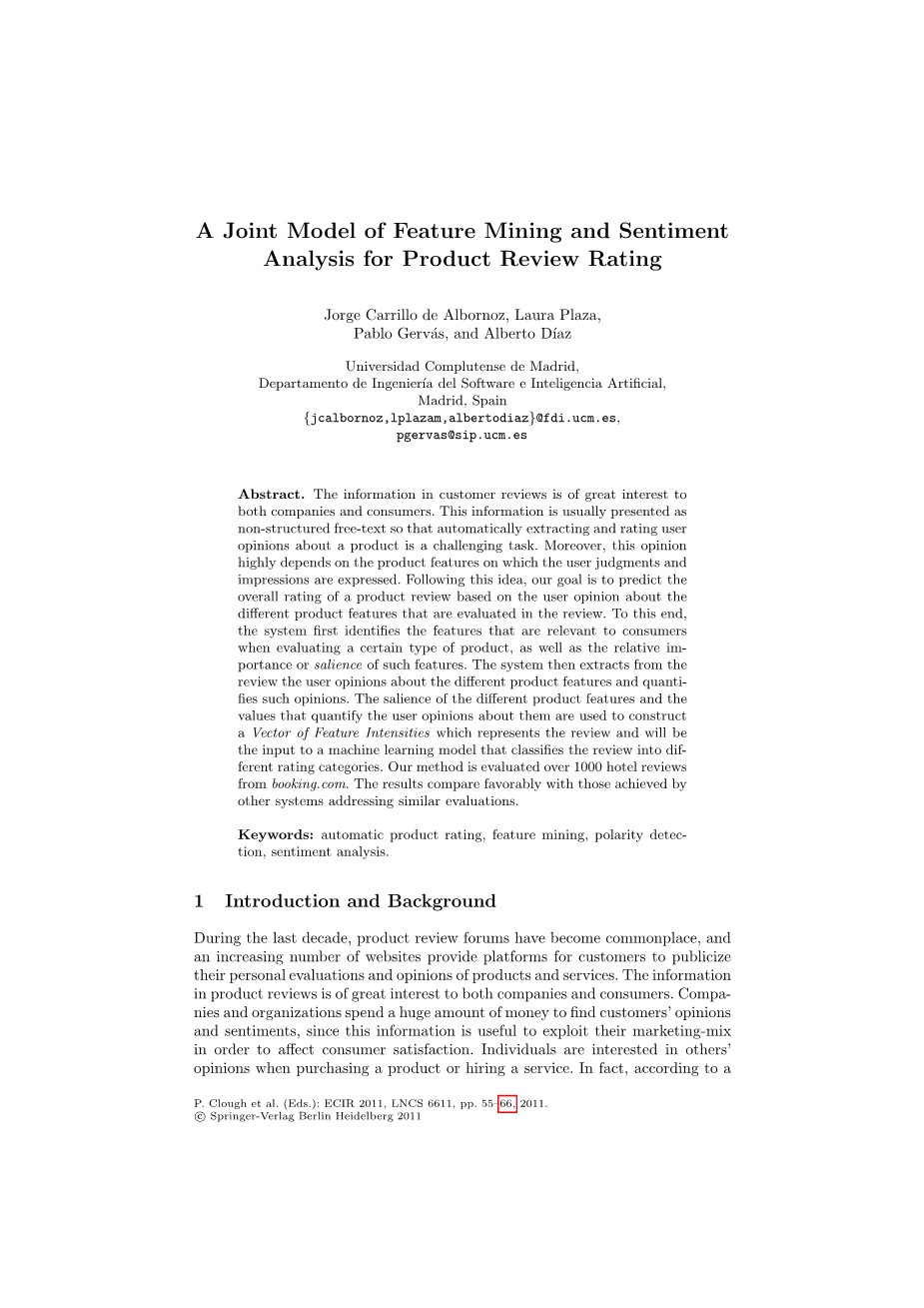专注于产品评论分类,在过去的十年中提出了各种方法。他们大多只考虑意见的极性(即负面与正面),并依赖机器学习(ML)技术对语言特征频率向量进行训练。庞等人。例如,在正负项频率上训练的三个ML算法之间进行比较,并得出结论:基于单元的SVM分类器可以有效地用于电影评论的极性分类。 Martineau和Finin [10]在同一语料库上使用类似的方法,使用Delta TF-IDF函数对词进行评分,然后将评论分为正片和负片。布鲁克[7]提出了一项更加雄心勃勃的任务,其目标是利用包括强化,否定,情态和话语结构在内的一系列语言特征,分别将不同类型产品的评论分为三类和五类评级。然而,这些方法都没有考虑影响意见极性的其他因素,尤其是这种极性的强度,例如审稿意见所表达的方面或特点以及它们之间的关系。我们假设人类有一个关于某个产品或服务的相关概念模型,这些模型明显影响了他们观点的极性和强度。例如,在评估一家酒店时,评论者似乎主要关注其酒店的位置,清洁度,等等。而其他方面,如附近的商店和餐馆或床的大小,则不那么重要。因此,我们认为,要成功理解用户对产品的看法,有必要结合特征挖掘和情感分析策略。