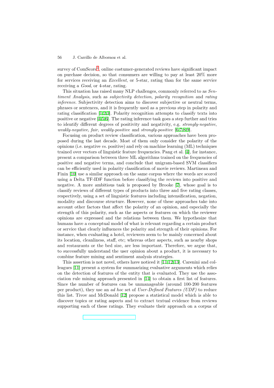 这种说法并不新奇,其他人已经注意到了[11,12,13]。 Carenini和同事[11]提出了一个总结评估论证的系统,该评估论点依赖于被评估实体的特征检测。 他们使用[14]中介绍的关联规则挖掘方法获得第一个特征列表。 由于功能的数量可能无法管理(每个产品大约有100-200个功能),因此它们使用一组特定的用户定义功能(UDF)来减少此列表。 Tivov和McDonald [12]提出了一个统计模型,该模型能够发现话题或评级方面,并从支持这些评级的评论中提取文本证据。他们通过TripAdvisor.com评估他们的酒店评论语料库。这种方法有两个主要的局限性:首先,它需要预先定义的一组方面来提取,这也需要伴随着用户评分(例如食物:2;装饰:1;服务:3;价值: 2)。这些信息通常在大多数评论集中都不可用,用户通常会给出一个独特的分数来表示他们对产品的总体评分,同时还有一段自由文本来描述他们对一个或多个产品方面的看法。其次,他们的系统使用表达方式来描述产品方面,比如对于服务方面的“很好的接待”或“有帮助的人”。我们认为,在前面的表达中“伟大的”和“有帮助的”这些词不应被认为代表方面服务的酒店,但可能会影响其他方面(例如“大房间”或“有帮助的班车服务”)。 Kim和Hovy [13]提出了一个系统,通过查找持有者和意见主题,从在线评论中自动提取利弊。但是,他们没有量化这些利弊的强弱,也没有预测评论的整体评分。