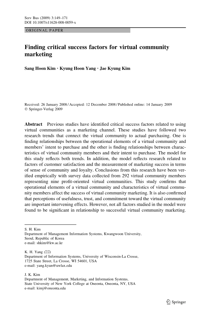 本文由虚拟社区的文献综述,研究模型和相关假设的描述,数据收集程序概述,结果分析和结论组成。 文献综述概述了与虚拟社区特征和成功因素有关的研究; 研究模型的描述包括13个关于这些特征和因素之间关系的假设; 数据收集和分析部分包括探索性因素分析,验证性分析和与假说有关的路径分析; 并且结论探讨了实证研究的实际应用及其局限性。