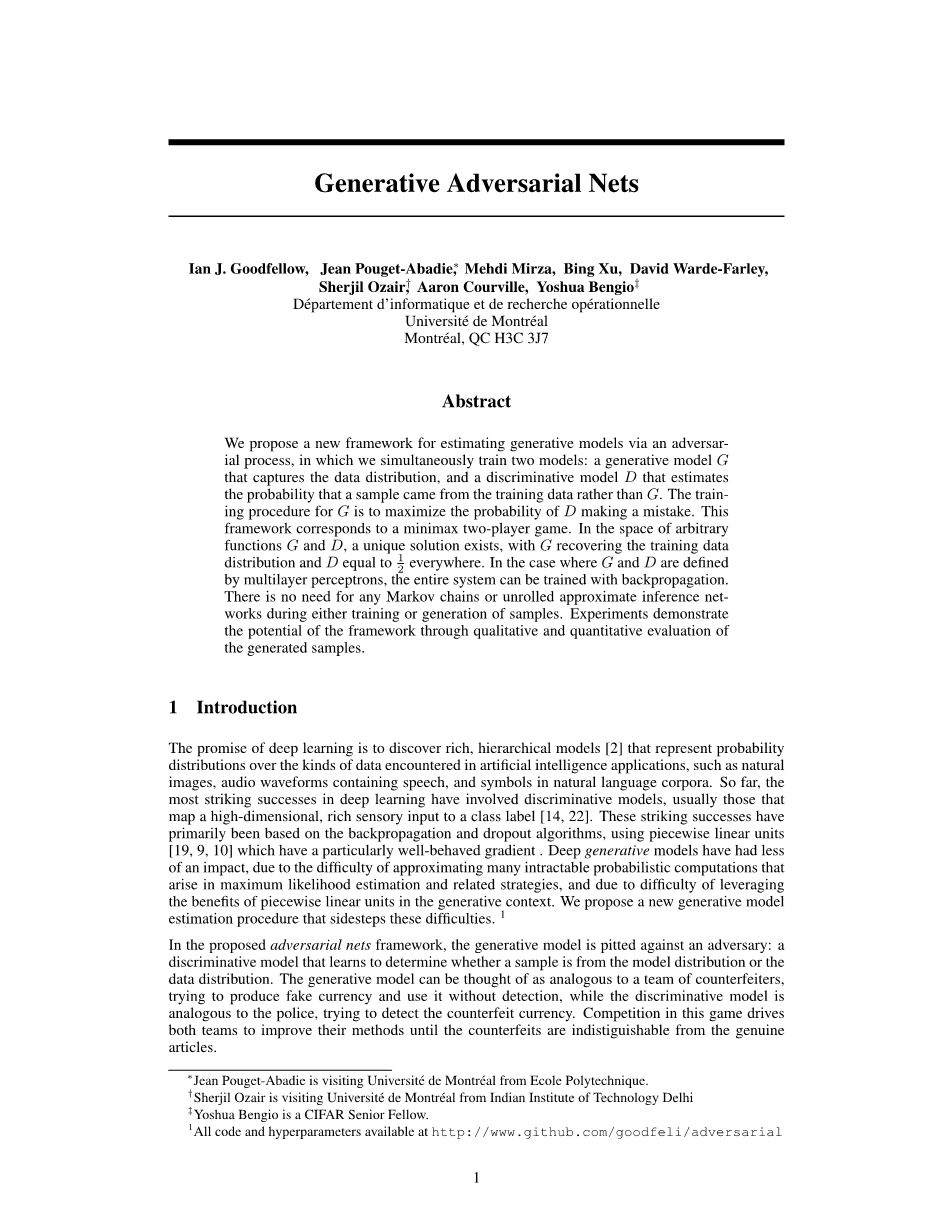 深度学习的承诺是发现丰富的分层的模型,用来代表在人工智能应用时遇到的各种数据的概率分布,比如自然图像,包含语音的音频波形和自然语言语料库中的符号。到目前为止,在深度学习领域最引人注目的成功包括判别模型,通常是那些将高维度,丰富的感知器输入映射到类标签的模型。这些引人注目的成功主要基于反向传播算法和丢弃算法,它们使用了拥有特别良好的梯度的分段线性单元。由于在最大似然估计和相关策略中出现的许多难对付的概率计算,以及很难利用在生成上下文中时使用分段线性单元的好处,深度生成模型所产生的影响较小。我们提出了一个新的生成模型估计程序,以避免这些困难。
