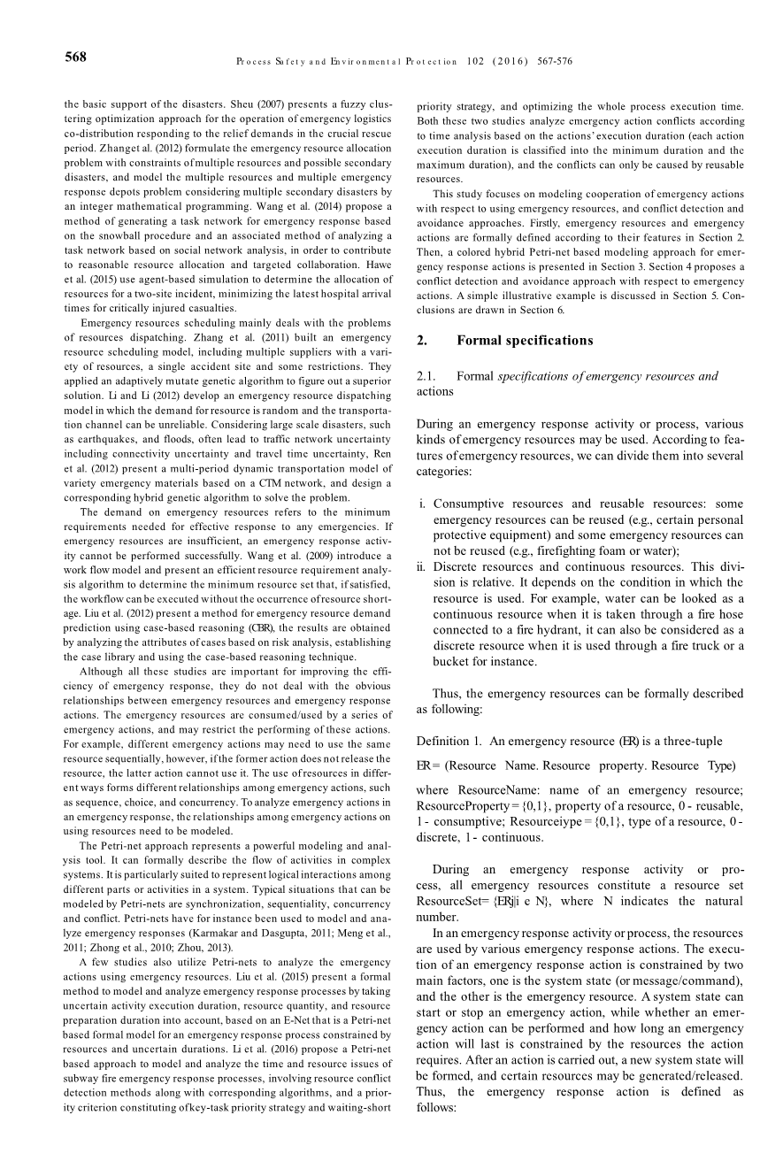 本研究的重点是在应急资源的使用方面建立应急行动的合作模型,以及冲突检测和规避方法。首先,根据第2节的特点,对应急资源和应急行动进行了形式化定义。然后,在第3节中,提出了一种基于有色混合petri网的应急响应建模方法。第4节提出了一种关于应急行动的冲突检测和避免方法。第5节讨论了一个简单的示例。第6节得出结论。