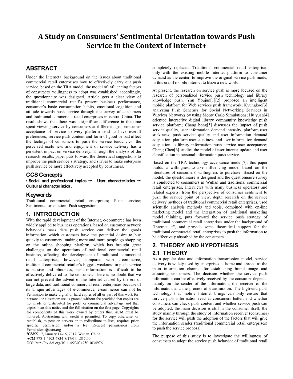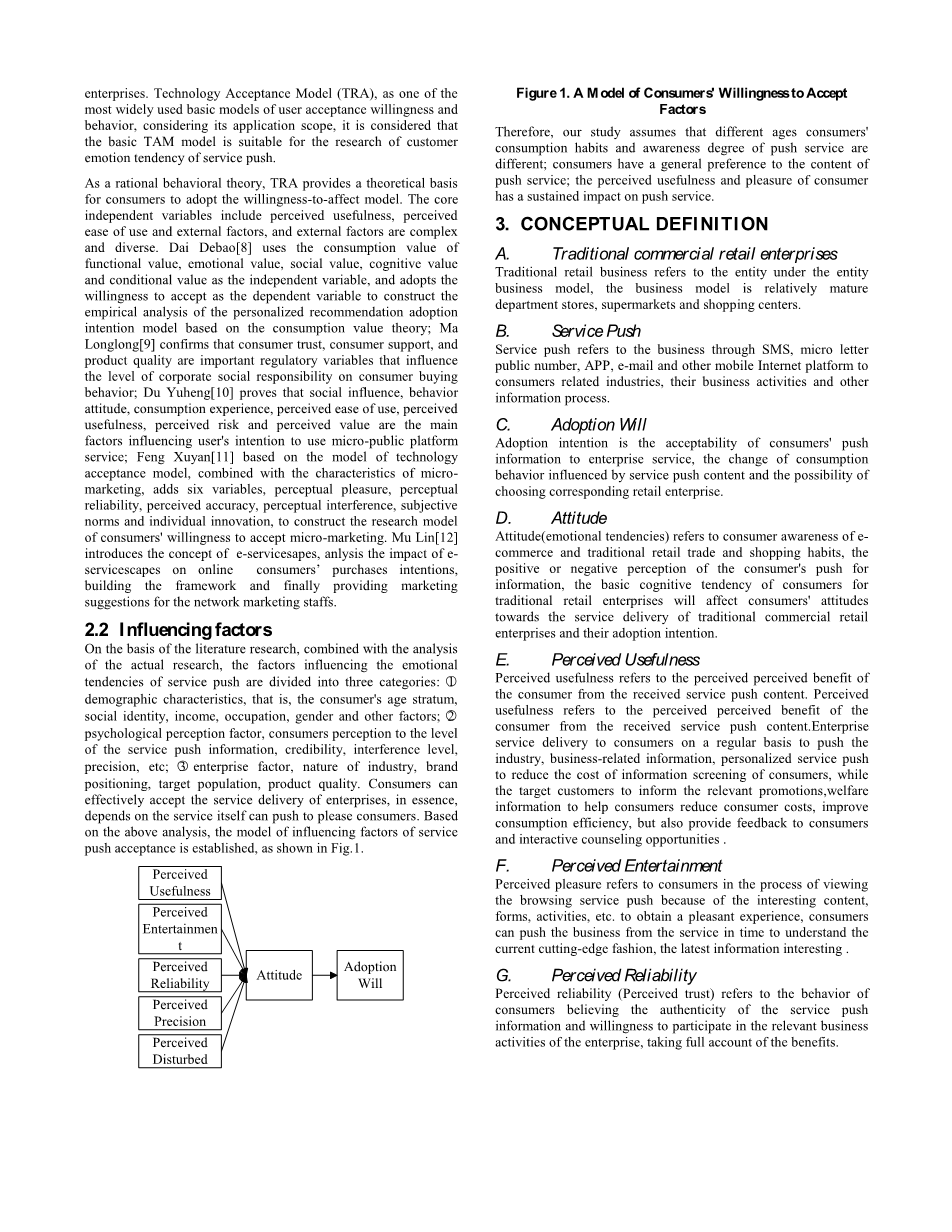 服务推送作为大数据时代一种普遍的数据、信息传递模式,正广泛得被国内外各类企业所运用,作为企业品牌形象建立、吸引消费者的主要信息渠道。而决定服务推送信息能否有效被消费者接收主要取决于信息发送者、信息接收者和传播过程。移动互联带来的高端推送技术只能保证服务推送信息较好的到达消费者,而消费者是否查阅推送内容,以及服务推送能否被采纳最主要的决定权还是在消费者本身,研究主要通过研究信息接收者(即消费者)对于服务推送采纳意愿的影响因素,从而给予信息发送者(即传统商业零售企业)以服务推送的建议。