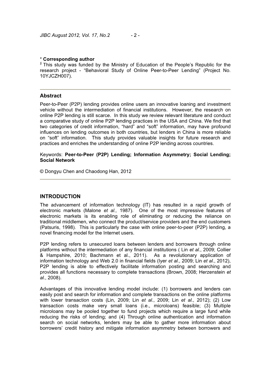 P2P贷款是指无担保贷款,借贷双方通过网络平台没有任何金融机构的中介(林等,2009;科利尔amp;汉普郡,2010;巴赫曼等,2011)。信息技术作为一种革命性的应用程序和Web 2.0在金融领域(艾耶等,2009;林等,2012),P2P贷款能有效地促进信息发布和搜索,并提供所有必要的功能来完成交易(布朗,2008;Herzenstein 等,2008)。