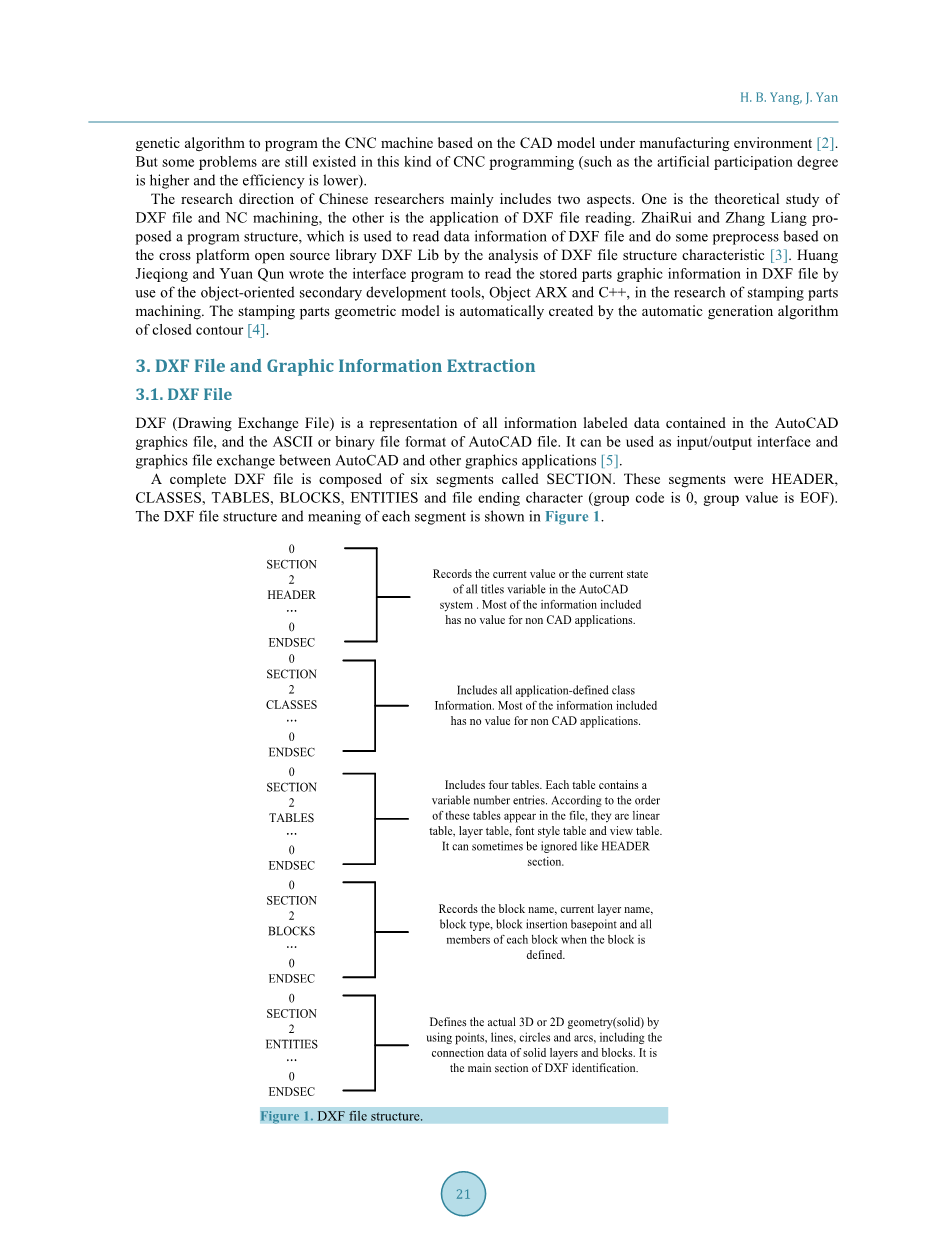 中国研究人员的研究方向主要包括两个方面:一个是DXF文件和NC加工的理论研究,另一个是DXF文件读取的应用。 张瑞和张良提出的程序的结构,这是用来读取DXF文件的数据信息,并通过DXF文件结构的分析做基于跨平台开源库DXF库一些预处理特性[3]。 黄杰琼和袁群在冲压件加工研究中,使用面向对象的二次开发工具Object ARX和C 编写了界面程序,以读取DXF文件中存储的零件图形信息。 冲压件的几何模型由封闭的轮廓[4]的自动生成算法自动创建。