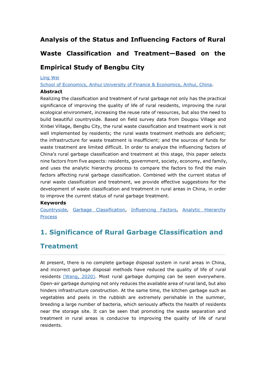 农村垃圾分类处理现状及影响因素分析-基于蚌埠市的实证研究外文翻译资料