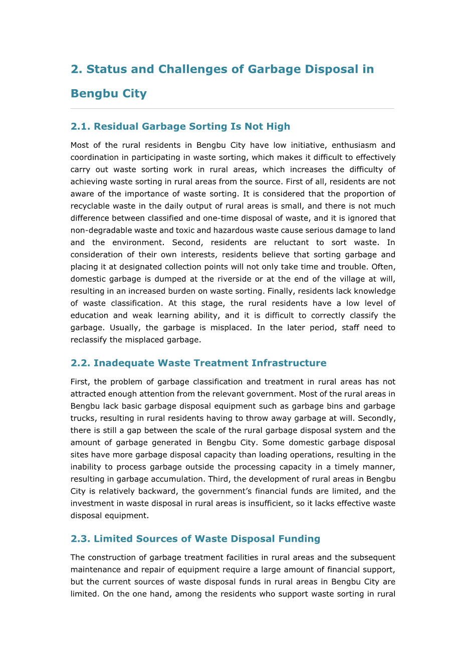 首先,农村地区的垃圾分类和处理问题尚未引起有关政府的重视。蚌埠市大部分农村地区缺少基本的垃圾处理设备,例如垃圾桶和垃圾车,导致农村居民不得不随意丢弃垃圾。其次,蚌埠市农村垃圾处理系统规模与垃圾产生量之间还存在差距。一些家庭垃圾处理场的垃圾处理能力比装载操作大,导致无法及时处理超出处理能力的垃圾,导致垃圾堆积。第三,蚌埠市农村发展相对落后,政府财政资金有限,农村垃圾处理投资不足,缺乏有效的垃圾处理设备。