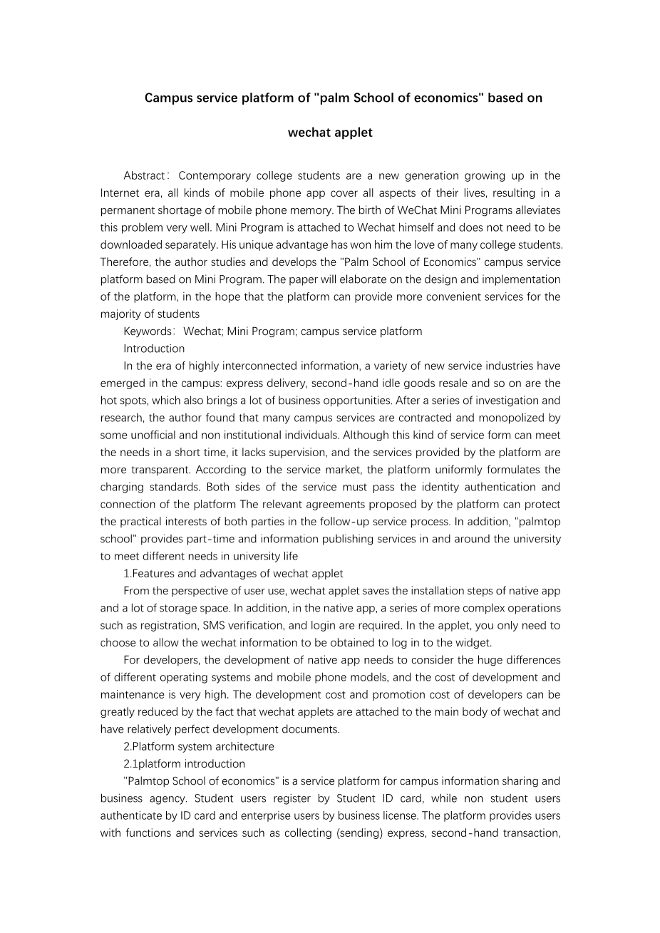 总言之,微信小程序这种新兴技术的兴起,给人们的生活 带来了更多的便利,而目前在校园服务这个领域小程序具有 很大的市场。广大学生对各式服务的需求也有很多,因此开发 基于微信小程序的校园服务平台是顺应时代发展的。本文设 计并开发了基于微信小程序的校园服务平台“掌上经院”,平 台依旧存在很大的进步空间,比如对校园服务需求的研究受 限于时间,部分已完成的功能在完整性以及稳定性方面仍需 进一步完善和提高;微信小程序的持续更新会废弃一些原有 的 API 或者特性(例如模板消息已无法申请并即将下线,需要 使用订阅消息替换),需要开发者持续跟进维护。在整个开发 过程中作者不仅温习了软件开发的完整流程,更对微信小程 序这一新兴技术有了更深刻地认知,虽然它现在发展还远谈 不上成熟,但作者相信凭借其独有的特性,小程序成为一种新 型快捷地服务方式是一种必然的趋势,随着微信小程序开发 框架的日臻成熟“,掌上经院”也会持续改进。