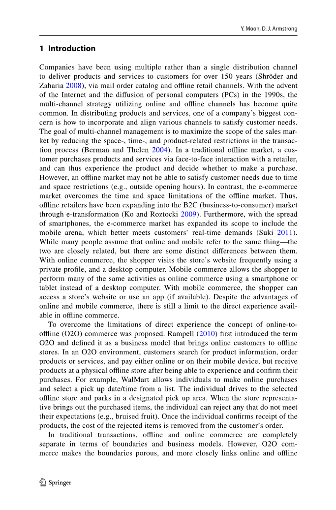 为了克服直接体验的局限性,提出了线上到线下(O2O)的商业概念,拉姆佩尔(2010)首先引入了“O2O”一词,并将其定义为一种将在线客户吸引到线下商店的业务模型。在O2O环境中,客户可以搜索产品信息,订购产品或服务,并在线上或者移动设备上支付,但是能在线下商店体验其购买的产品产品并确认购买。例如,沃尔玛允许个人进行在线购买,并从列表中选择提货日期/时间。顾客开车到所选的线下商店,并停在指定的接客区域。当商店拿出其购买的物品,顾客可以拒绝任何不符合他们期望的东西(例如坏掉的水果)。个人确认收到物品后,将从客户的订单中扣除拒收商品的成本。