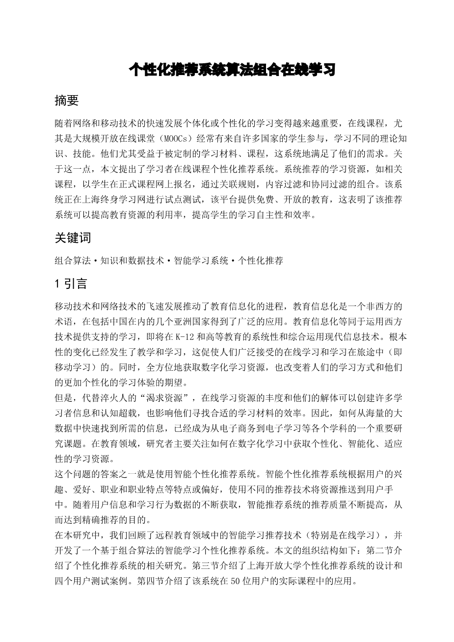 个性化推荐系统算法组合在线学习外文翻译资料 2022-08-13 15:26:30 英语原文共 11 页,剩余内容已隐藏,支付完成后下载完整资料 英语译文共 11 页,剩余内容已隐藏,支付完成后下载完整资料 资料编号:[236108],资料为PDF文档或Word文档,PDF文档可免费转换为Word 原文和译文剩余内容已隐藏,您需要先支付 30元 才能查看原文和译文全部内容!立即支付 发小红书推广免费获取该资料资格。点击链接进入获取推广文案即可: Ai一键组稿 | 降AI率 | 降重复率 | 论文一键排版 PREVIOUS NEXT 您可能感兴趣的文章 基于关键词查询的聚焦网络爬虫外文翻译资料 移动社交媒体中网络舆论传播模型的构建、仿真与 实证研究外文翻译资料 钢铁工业共生网络的定量环境风险评估外文翻译资料 社交媒体网络中的知识扩散: 声誉机制和知识角色分配的影响外文翻译资料 基于情感分析的数字化内容平台用户行为研究外文翻译资料 知识管理在客户关系管理过程中的应用外文翻译资料 您如何定义和衡量研究生产力?外文翻译资料 对WEEE的再制造与回收的权衡以及中国基金政策下的环境影响外文翻译资料 数据库开发过程外文翻译资料 双边平台间的两部分关税竞争外文翻译资料