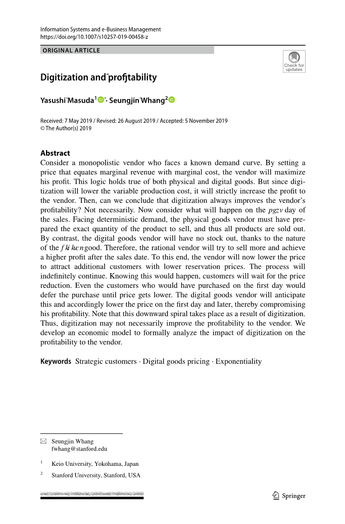 摘要:考虑一个已知需求曲线的垄断供应商。通过设置一个等于边际收益与边际成本的价格,供应商将最大化他的收益。这种逻辑适用于实物和数字商品。但是由于数字化将降低可变生产成本,因此它将大大地增加供应商的利润。然后,我们可以得出数字化总是可以提高供应商的盈利能力的结论吗?未必。现在考虑第二天的销售会发生什么。面对确定性需求,实物商品供应商必须已准备好要销售的确切数量的产品,因此所有产品都会售罄。相比之下,由于数字商品的性质,数字商品供应商将不会缺货。因此,理性的供应商将尝试在销售时出售更多并达到更高的收益。为此,供应商现在将降低价格,以较低的保留价格吸引更多客户。该过程将不断地继续。因为知道会发生这种情况,客户将等待降价。即使是在第一天就愿意购买的客户也将推迟购买,直到价格降低为止。数字商品供应商会预料到这一点,因此会在第一天及以后降低价格,从而损害其盈利能力。请注意,这种向下螺旋是数字化的结果。因此,数字化可能未必会改善供应商的盈利能力。我们开发了一种经济模型来正式分析数字化对供应商可盈利性的影响。
