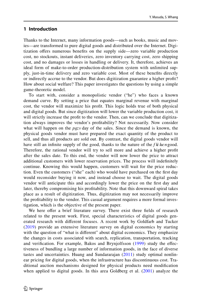 首先,考虑一个已知需求曲线的垄断供应商(“他”)。通过设置一个等于边际收益和边际成本的价格,供应商将最大化他的利润。这一逻辑适用于实体商品和数字商品。但是,由于数字化将降低可变的生产成本,它就会增加供应商的利润。然后,我们可以得出数字化总是可以提高供应商的盈利能力的结论吗?未必。现在考虑一下在销售的第二天会发生什么。由于需求是已知的,实体商品销售商必须准备好要出售的产品的数量,因此所有产品都会售罄。相比之下,由于数字商品的性质,数字商品销售商仍将拥有无限的商品供应。因此,理性的销售商会尝试在销售日期之后卖出更多的产品并获得更高的利润。因此,卖主现在会降低价格,进程将无限期地继续下去。明知会发生这种情况,顾客会等待降价。甚至在第一天就会购买的顾客(每个“她”)现在也会重新考虑购买,而选择等待。数字商品销售商将预见到这一点,并相应地在第一天和以后降低价格,,从而损害其盈利能力。注意,这种螺旋式下降是数字化的结果。因此,数字化不一定能提高供应商的盈利能力。这种不经意的转变需要更正式的调查,而这正是本论文的目的。