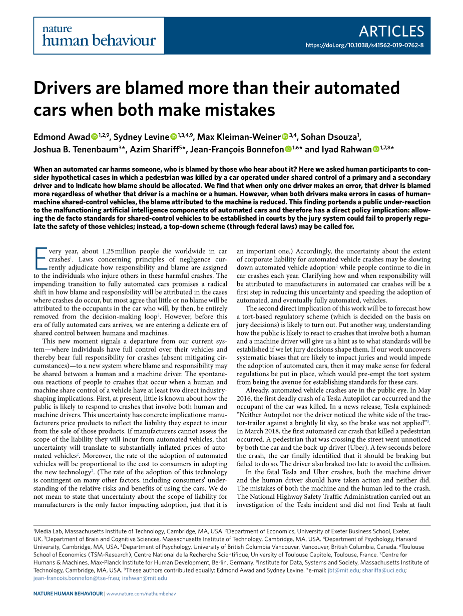 1媒体实验室,麻省理工学院,剑桥,硕士,美国。经济系,埃克塞特大学商学院,埃克塞特,英国。麻省理工学院脑与认知科学系,剑桥,马萨诸塞州,美国。心理学系,哈佛234 剑桥大学,硕士,美国。不列颠哥伦比亚大学心理学系,温哥华,温哥华,不列颠哥伦比亚,加拿大。图卢兹56 经济学院(TSM研究),国家科学研究中心,图卢兹首都大学,图卢兹,法国。中心7 人与机器,马克斯·普朗克人类发展研究所,柏林,德国。数据、系统和社会研究所,麻省理工学院,剑桥,马萨诸塞州,美国。这些作者同样贡献:埃德蒙阿瓦德和悉尼莱文。*电子邮箱:jbt@mit.edu;shariffa@uci.edu;jean-francois.bonnefon@tse-fr.eu;irahwan@mit.edu89 |