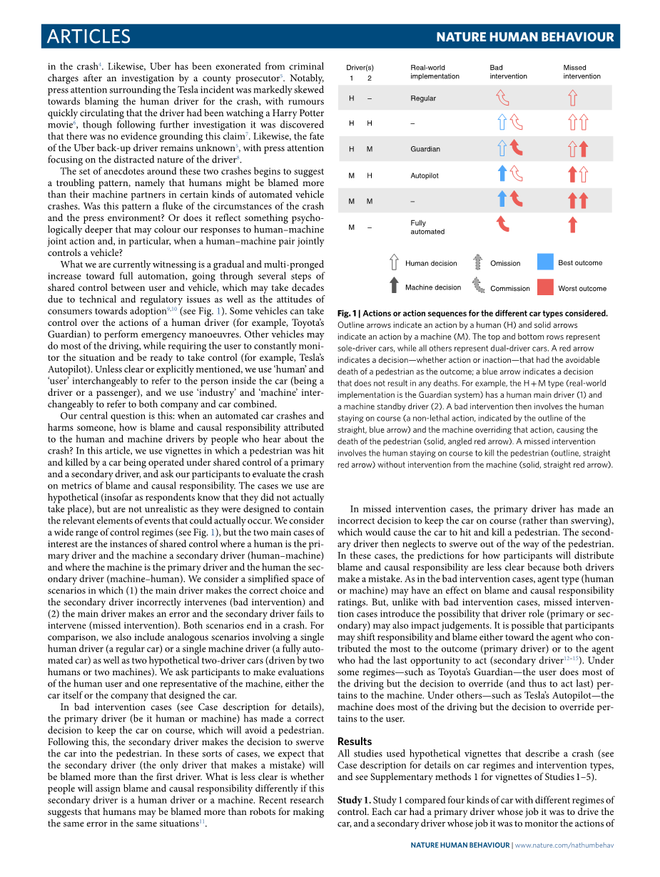 围绕这两起车祸的一系列轶事开始显示出一种令人不安的模式,即在某些类型的自动车辆碰撞中,人类可能比机器伙伴受到更多的指责。这种模式是对坠机事件和新闻环境的侥幸心理吗?或者它是否反映了更深层次的心理反应,可能会影响我们对人-机联合行动的反应,特别是当一对人-机联合控制一辆车时?