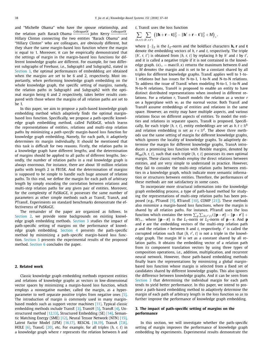 Barack Obama Sasha Obama Michelle Obama连接了Barack Obama和Michelle Obama这两个实体。显然这连个实体是有配偶的关系的。以及关系路径:Barack Obama John Kerry Hillary Clinton连接了互为同事的两个实体Barack Obama和Hillary Clinton。这两个同事的关系显然不同,但它们具有相同的基于边缘的损失函数,其中边缘为1。此外,可以通过实证证明,不同知识图的基于边缘的损失函数的边缘设置是不同的。例如,对于Freebase的两个不同的子图,即, Subgraph1和Subgraph2,如第3节所述,得到了将边距分别设置为6和2时的最优嵌入性能。最重要,当执行知识图嵌入在整个知识图,利润率的具体设置,即关系路径Subgraph1和Subgraph2 opti-mal利润率分别是6和2,需要更好的结果,那些边缘的所有关系路径设置为1。