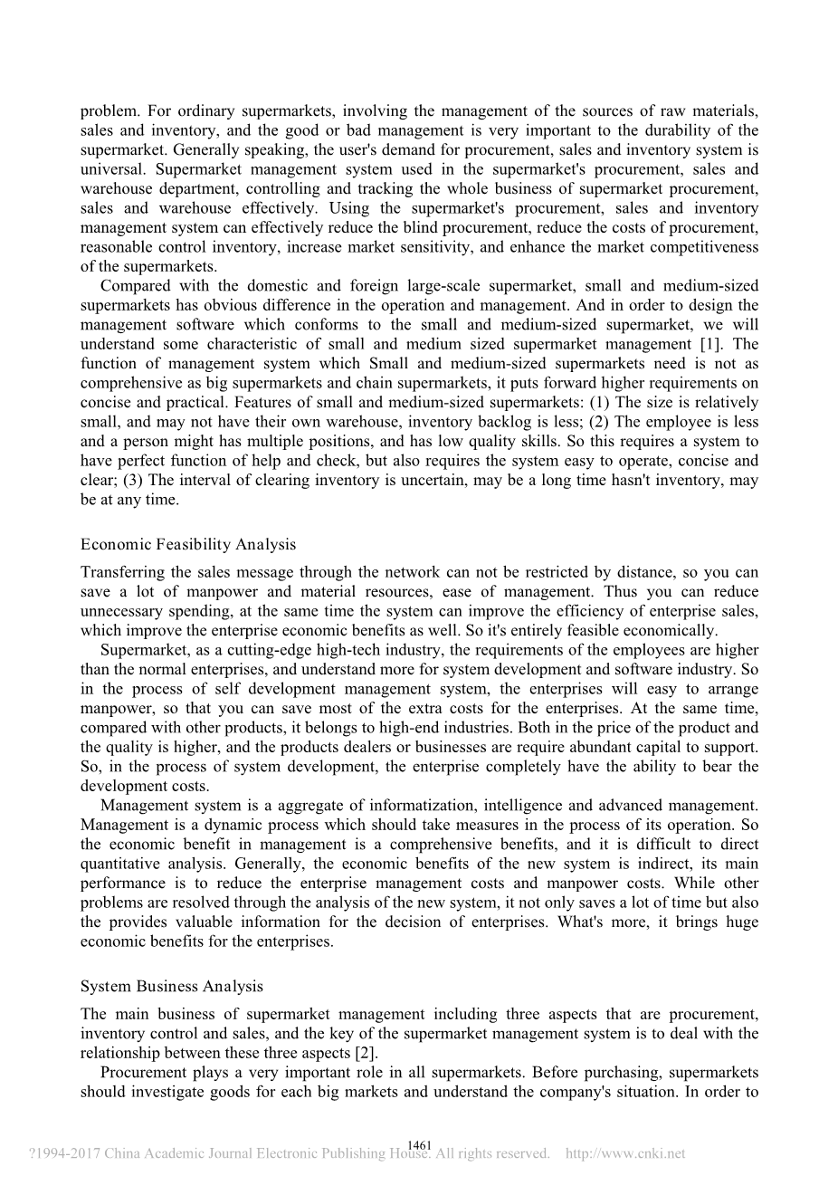 中小超市在我国经济发展中占有重要地位。目前,我国有大量的中小型超市,区域分布广泛, 而中小超市的信息化水平还很低。随着科技的发展,计算机的操作和管理日益简化,计算机知识的日益普及。同时,随着市场经济的快速变化和激烈竞争,超市业必须利用计算机来管理库存、销售等诸多环节。作为一个小型和中型超市,他们的主要业务是销售产品。但目前还存在很多的问题在系统运行中,所有的销售订单都是人工填写,费时且容易出错;库存是人工记账,无法跟踪最准确的库存情况;销售数据,往往花费大量的时间和精力去计算每个企业会员和每个好销售的销售业绩。为了解决上述问题,提高经济效益,我们将为超市的计算机化管理做准备。
