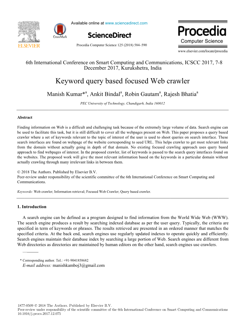 基于关键字查询的聚焦爬虫程序使用元数据指导爬虫过程。关键字数据集用于创建有效的查询,得到的结果反馈给系统。印度一个名为Sandhan[6]的旅游和健康项目就是一个例子,它是一个多语言平台。这一项目旨在利用N-gram方法辨识网页的语言。出于培训目的,使用区域、非区域和健康查询。Tang等人。[7] 提出了一种针对医学信息相关性和检索到的网页质量的有针对性的检索方法。它们使用关联反馈爬虫,使用逐例查询。Altingovde等人。[8] 构造了一个查询引擎,这一引擎允许对提取的数据进行关键字和高级查询。最终生成了一个特定于域的Web门户,它可以从后端数据库中提取信息。