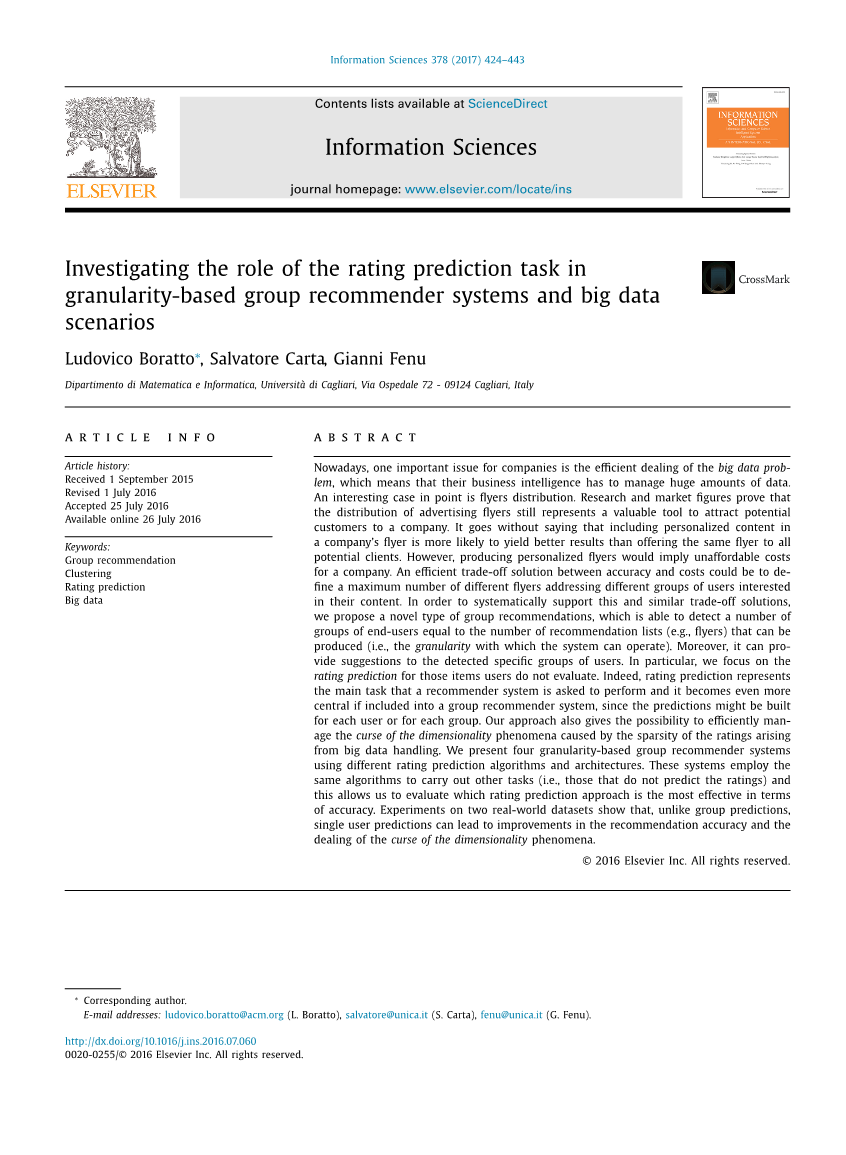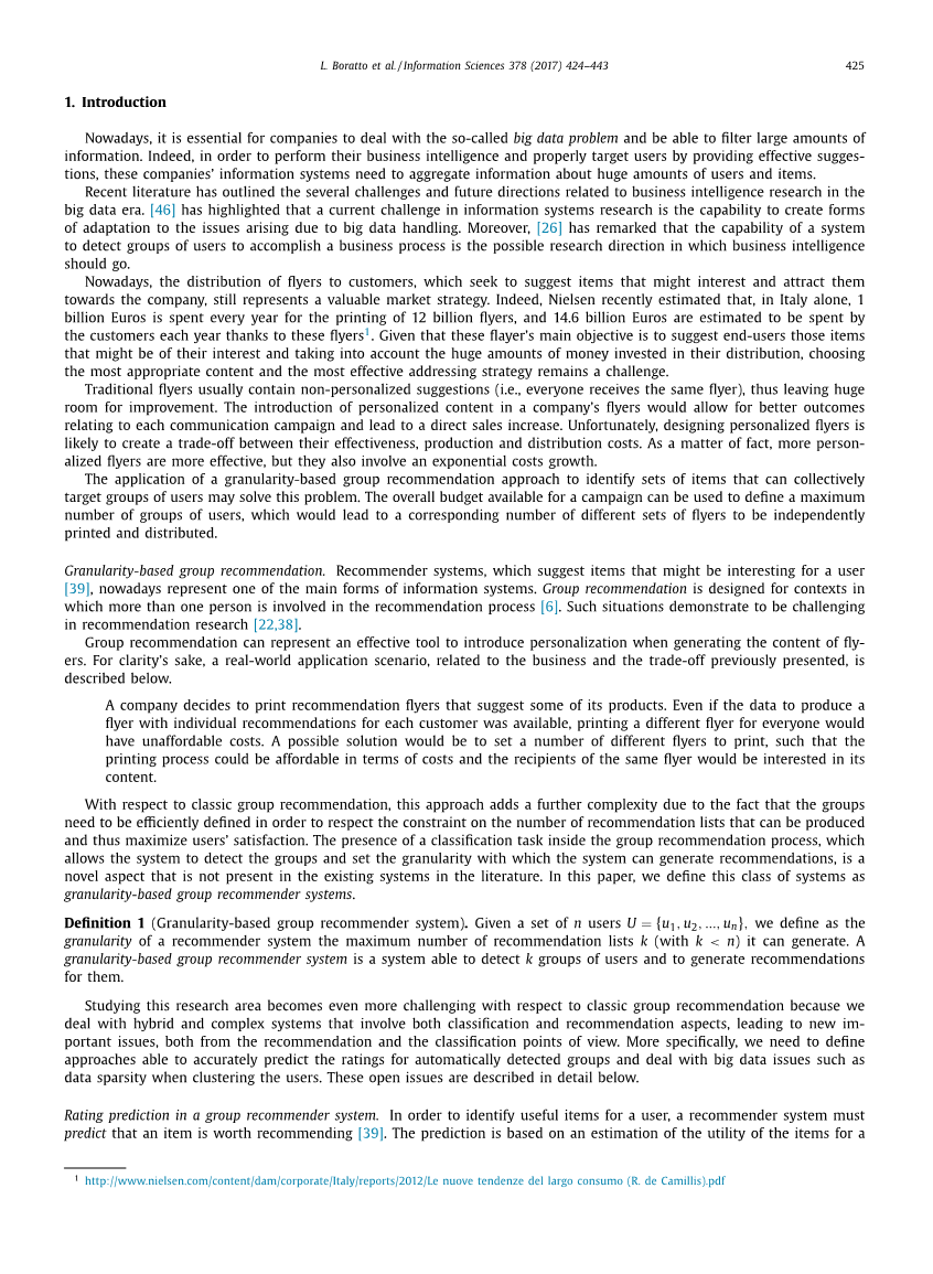 摘要:如今,公司面临的一个重要问题是高效处理大数据问题,这意味着他们的商业智能必须管理大量数据。一个有趣的例子是传单分发。研究和市场数据证明,广告传单的分发仍然是吸引潜在用户到公司的有价值的工具。毫无疑问,在公司传单中包含个性化的内容比向所有潜在客户提供相同的传单更可能产生好的结果。然而,制作个性化的传单意味着公司无法承受的成本。准确性和成本之间有效的权衡解决方案是定义针对其内容感兴趣的的不同用户群的最大数量的不同传单。为了系统地支持这种和类似的解决方案,我们提出了一种新颖的群组推荐方法,它能够检测多个终端用户群,其数量等于生成的推荐列表的数量(即系统可以运行的粒度)。此外,它可以为被检测的特定用户组提供建议。特别是,我们关注用户未评分项目的评级预测。实际上,评级预测表示要求推荐系统执行的主要任务,并且如果包含在群组推荐系统中则更加重要,因为可以为每个用户或每个组建立预测。我们的方法还有可能有效地管理维度现象的麻烦,而这种麻烦是由大数据处理导致的评级稀疏性引起的。我们提出了四种基于粒度的组推荐系统,它们使用不同的评级预测算法和体系结构。这些系统使用相同的算法来执行其他任务(即那些不预测评级的任务),这使我们能够评估哪种评级预测方法在准确性方面最有效。对两个真实世界数据集的实验表明,与群体预测不同,单用户预测可以提高推荐准确度和处理维度现象的麻烦。